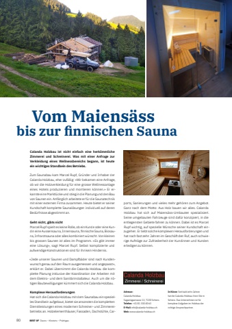 801 BEST OF BEST OF Portrait xxx Davos %u2013 Klosters %u2013 Pr%u00e4ttigau Vom Maiens%u00e4ssbis zur fi nnischen SaunaAdresse:Calanda HolzbauSagast%u00e4gastrasse 13, 7220 Schiers Telefon: +41 81 330 40 63 E-Mail: info@calanda-holzbau.ch Web: www.calanda-holzbau.chIn K%u00fcrze: Seit bald zehn Jahren hat die Calanda Holzbau ihren Sitz in Schiers. Das Unternehmen ist f%u00fcr komplexe Aufgaben im Holzbau der richtige Ansprechpartner. Calanda Holzbau ist nicht einfach eine herk%u00f6mmliche Zimmerei und Schreinerei. Was mit einer Anfrage zur Verkleidung eines Wellnessbereichs begann, ist heute ein wichtiges Standbein des Betriebs. Zum Saunabau kam Marcel Rupf, Gr%u00fcnder und Inhaber der Calanda Holzbau, eher zuf%u00e4llig: %u00abWir bekamen eine Anfrage, ob wir die Holzverkleidung f%u00fcr eine grosse Wellnessanlage eines Hotels produzieren und montieren k%u00f6nnen.%u00bb Er erkannte eine Marktl%u00fccke und stieg in die Planung und den Bau von Saunen ein. Anf%u00e4nglich arbeitete er f%u00fcr die Saunatechnik mit einer externen Firma zusammen. Heute bietet er seiner Kundschaft komplette Saunal%u00f6sungen individuell auf deren Bed%u00fcrfnisse abgestimmt an.Geht nicht, gibts nichtMarcel Rupf spielt es keine Rolle, ob ein Kunde oder eine Kundin eine Aussensauna, Innensauna, fi nnische Sauna, Biosauna, Infrarotsauna oder alles kombiniert w%u00fcnscht. Von kleinen bis grossen Saunen ist alles im Programm. %u00abEs gibt immer eine L%u00f6sung%u00bb, sagt Marcel Rupf. Selbst komplizierte und aufwendige Konstruktionen sind f%u00fcr ihn kein Hindernis.%u00abJede unserer Saunen und Dampfb%u00e4der sind nach Kundenwunsch genau auf den Raum ausgemessen und angepasst%u00bb, erkl%u00e4rt er. Dabei %u00fcbernimmt die Calanda Holzbau die komplette Planung inklusive der Koordination der Arbeiten mit dem Elektro- und dem Sanit%u00e4rinstallateur. Auch um die n%u00f6tigen Baubewilligungen k%u00fcmmert sich die Calanda Holzbau.Komplexe HerausforderungenHat sich die Calanda Holzbau mit dem Saunabau ein spezielles Standbein aufgebaut, bietet sie ansonsten die kompletten Dienstleistungen eines modernen Schreiner- und Zimmereibetriebs an. Holzelementh%u00e4user, Fassaden, Dachst%u00fchle, Carports, Sanierungen und vieles mehr geh%u00f6ren zum Angebot. Ganz nach dem Motto: Aus Holz bauen wir alles. Calanda Holzbau hat sich auf Maiens%u00e4ss-Umbauten spezialisiert. Seine umgebauten Fahrzeuge sind daf%u00fcr konzipiert, in die entlegensten Gebiete fahren zu k%u00f6nnen. Dabei ist es Marcel Rupf wichtig, auf spezielle W%u00fcnsche seiner Kundschaft einzugehen. Er liebt solche komplexen Herausforderungen und hat nach fast zehn Jahren im Gesch%u00e4ft den Ruf, auch schwierige Auftr%u00e4ge zur Zufriedenheit der Kundinnen und Kunden erledigen zu k%u00f6nnen.