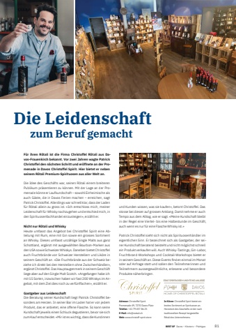 BEST OF Davos %u2013 Klosters %u2013 Pr%u00e4ttigau BEST OF Portrait xxx 81Die Leidenschaft zum Beruf gemachtAdresse: Christoffel SpiritPromenade 49, 7270 Davos PlatzTelefon: +41 79 457 86 25E-Mail: info@roetali.chWeb: www.christoff-spirit.storeIn K%u00fcrze: Christoffel Spirit bietet ein breites Sortiment an Spirituosen an. Herzst%u00fcck des Gesch%u00e4fts ist der nach traditionellem Rezept hergestellte R%u00f6tali des Unternehmens. F%u00fcr ihren R%u00f6tali ist die Firma Christoffel R%u00f6tali aus Davos-Frauenkirch bekannt. Vor zwei Jahren wagte Patrick Christoffel den n%u00e4chsten Schritt und er%u00f6ffnete an der Promenade in Davos Christoffel Spirit. Hier bietet er neben seinem R%u00f6tali Premium-Spirituosen aus aller Welt an. Die Idee des Gesch%u00e4fts war, seinen R%u00f6tali einem breiteren Publikum pr%u00e4sentieren zu k%u00f6nnen. Mit der Lage an der Promenade k%u00f6nne er Laufkundschaft %u2013 sowohl Einheimische als auch G%u00e4ste, die in Davos Ferien machen %u2013 erreichen, sagt Patrick Christoffel. Allerdings war schnell klar, dass der Laden f%u00fcr R%u00f6tali allein zu gross ist. %u00abIch entschloss mich, meiner Leidenschaft f%u00fcr Whisky nachzugehen und entschied mich, in den Spirituosenfachhandel einzusteigen%u00bb, erz%u00e4hlt er.Nicht nur R%u00f6tali und WhiskyHeute umfasst das Angebot bei Christoffel Spirit eine Abteilung mit Rum, eine mit Gin sowie ein grosses Sortiment an Whisky. Dieses umfasst unz%u00e4hlige Single Malts aus ganz Schottland, erg%u00e4nzt mit ausgew%u00e4hlten Bourbon-Marken aus den USA sowie Schweizer Whiskys. Daneben bietet Christoffel auch Fruchtbr%u00e4nde von Schweizer Herstellern und Lik%u00f6re in seinem Gesch%u00e4ft an. %u00abDie Fruchtbr%u00e4nde aus der Schweiz beziehe ich direkt bei den Herstellern ohne Zwischenh%u00e4ndler%u00bb, erg%u00e4nzt Christoffel. Das Hauptaugenmerk in seinem Gesch%u00e4ft liege aber auf den Single Malt Scotch. %u00abAngefangen habe ich mit 15 Sorten, inzwischen haben wir fast 200 Whiskys im Angebot, mit dem Ziel dies noch zu verf%u00fcnffachen%u00bb, erz%u00e4hlt er.Gastgeber aus LeidenschaftDie Beratung seiner Kundschaft liegt Patrick Christoffel besonders am Herzen. In seiner Bar im Laden hat er von jedem Produkt, das er anbietet, eine offene Flasche. So kann seine Kundschaft jeweils einen Schluck degustieren, bevor sie sich zum Kauf entscheidet. %u00abMir ist es wichtig, dass die Kundinnen und Kunden wissen, was sie kaufen%u00bb, betont Christoffel. Das stosse bei diesen auf grossen Anklang. Damit nehme er auch Tempo aus dem Alltag, wie er sagt. %u00abMeine Kundschaft bleibt in der Regel eine Viertel- bis eine Halbestunde im Gesch%u00e4ft, auch wenn es nur f%u00fcr eine Flasche Whisky ist.%u00bbPatrick Christoffel sieht sich nicht als Spirituosenh%u00e4ndler im eigentlichen Sinn. Er bezeichnet sich als Gastgeber, der seiner Kundschaft beratend beisteht und nicht m%u00f6glichst schnell ein Produkt verkaufen will. Auch Whisky-Tastings, Gin-Labor, Fruchtbrand-Workshops und Cocktail-Workshops bietet er in seinem Gesch%u00e4ft an. Diese Events fi nden einmal im Monat oder auf Anfrage statt und sollen den Teilnehmerinnen und Teilnehmern aussergew%u00f6hnliche, erlesene und besondere Produkte n%u00e4herbringen.