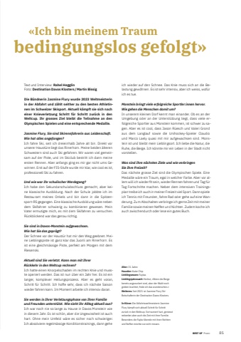 BEST OF BEST OF Promi 852Text und Intervie Rahel HegglinFoto: Destination Davos Klosters / Martin BissigDie B%u00fcndnerin Jasmine Flury wurde 2023 Weltmeisterin in der Abfahrt und z%u00e4hlt seither zu den besten Athletinnen im Schweizer Skisport. Aktuell k%u00e4mpft sie sich nach einer Knieverletzung Schritt f%u00fcr Schritt zur%u00fcck in den Weltcup. Ihr grosses Ziel bleibt die Teilnahme an den Olympischen Spielen und eine entsprechende Medaille.Jasmine Flury, Sie sind Skirennfahrerin aus Leidenschaft. Wie hat alles angefangen?Ich fahre Ski, seit ich dreieinhalb Jahre alt bin. Direkt vor unserer Haust%u00fcre liegt das Rinerhorn. Meine beiden %u00e4lteren Schwestern sind auch Ski gefahren. Wir waren viel gemeinsam auf der Piste, und im Skiclub bestritt ich dann meine ersten Rennen. Aber anfangs ging es mir gar nicht ums Gewinnen. Erst auf der FIS-Stufe wurde mir klar, wie cool es ist, professionell Ski zu fahren.Und wie war Ihr schulischer Werdegang?Ich habe den Sekundarschulabschluss gemacht, aber keine klassische Ausbildung. Nach der Schule jobbte ich im Restaurant meines Onkels und bin dann in die Spitzensport-RS gegangen. Eine klassische Ausbildung w%u00e4re neben dem Skifahren schwierig zu kombinieren gewesen. Mein Vater ermutigte mich, es mit dem Skifahren zu versuchen. R%u00fcckblickend war das genau richtig.Sie sind in Davos-Monstein aufgewachsen. Wie hat Sie das gepr%u00e4gt?Der Schnee vor der Haust%u00fcr hat mir den Weg geebnet. Meine Lieblingspiste ist ganz klar das Juonli am Rinerhorn. Es ist eine gleichm%u00e4ssige Piste, perfekt am Morgen mit dem Riesenski. Aktuell sind Sie verletzt. Kann man mit Ihrer R%u00fcckkehr in den Weltcup rechnen?Ich hatte einen Knorpelschaden im rechten Knie und musste operiert werden. Das ist nun %u00fcber ein Jahr her. Es ist ein langer, komplexer Heilungsprozess. Aber es geht voran, Schritt f%u00fcr Schritt. Ich hoffe sehr, dass ich n%u00e4chste Saison wieder fahren kann. Im Moment arbeite ich intensiv daran. Sie werden in Ihrer Verletzungsphase von Ihrer Familie und Freunden unterst%u00fctzt. Wie sieht Ihr Alltag aktuell aus?Ich war noch nie so lange zu Hause in Davos Monstein wie in diesem Jahr. Es ist sch%u00f6n, aber die Ungewissheit ist auch hart. Ohne mein Umfeld w%u00e4re es sicher noch schwieriger. Ich absolviere regelm%u00e4ssige Konditionstrainings, dann gehe ich wieder auf den Schnee. Das Knie muss sich an die Belastung gew%u00f6hnen. Es ist sehr intensiv, aber ich weiss, wof%u00fcr ich es tue.Monstein bringt viele erfolgreiche Sportler:innen hervor. Wie gehen die Menschen damit um? In unserem kleinen Dorf kennt man einander. Ob es an der Umgebung oder an der Unterst%u00fctzung liegt, dass viele erfolgreiche Sportler aus Monstein kommen, ist schwer zu sagen. Aber es ist cool, dass Jason R%u00fcesch und Valeri Grond aus dem Langlauf sowie die Unihockey-Spieler Claudio und Marco Laely quasi mit mir aufgewachsen sind. Monstein ist und bleibt mein Lieblingsort. Ich liebe die Natur, die Ruhe, die Berge. Ich k%u00f6nnte mir ein Leben in der Stadt nicht vorstellen.Was sind Ihre n%u00e4chsten Ziele und wie verbringen Sie Ihre Freizeit?Das n%u00e4chste grosse Ziel sind die Olympischen Spiele. Eine Medaille w%u00e4re ein Traum, egal in welcher Farbe. Aber vor allem will ich wieder fi t sein, wieder Rennen fahren und Tag f%u00fcr Tag Fortschritte machen. Neben dem intensiven Trainingsplan treibe ich auch in meiner Freizeit viel Sport. Dann spiele ich Tennis mit Freunden, fahre Rad oder gehe auf eine Wanderung. Zum Abschalten verbringe ich gerne Zeit mit meiner Familie sowie meinen Neffen und Nichten. Zudem koche ich auch zwischendurch oder lese ein gutes Buch.Alter: 31 JahreHaustier: Kater ChipLieblingsessen: FajitasLieblingsjahreszeit: Herbst, %u00abWenn die Berge bereits angezuckert sind, aber der Wald noch golden leuchtet, fi nde ich das wundersch%u00f6n.%u00bbWeiteres: Seit 2021 ist Jasmine Flury SkiBotschafterin der Destination Davos Klosters.In K%u00fcrze: Die Abfahrtsweltmeisterin Jasmine Flury k%u00e4mpft sich aktuell Schritt f%u00fcr Schritt zur%u00fcck in den Weltcup. Sie trainiert hart, geniesst nebenbei aber auch die Zeit mit ihrer Familie. Besonders die Fajita-Abende mit ihren Nichten und Neffen m%u00f6chte sie nicht missen. %u00abIch bin meinem Traum bedingungslos gefolgt%u00bb