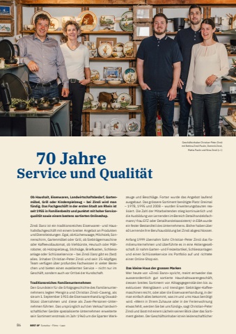 861 BEST OF BEST OF Portrait xxx Surselva %u2013 Flims %u2013 Laax 70 Jahre Service und Qualit%u00e4tOb Haushalt, Eisenwaren, Landwirtschaftsbedarf, Gartenm%u00f6bel, Grill oder Kinderspielzeug %u2013 bei Zinsli wird man f%u00fcndig. Das Fachgesch%u00e4ft in der ersten Stadt am Rhein ist seit 1955 in Familienbesitz und punktet mit hoher Servicequalit%u00e4t sowie einem bestens sortierten Onlineshop.Zinsli Ilanz ist ein traditionsreiches Eisenwaren- und Haushaltsfachgesch%u00e4ft mit einem breiten Angebot an Produkten und Dienstleistungen. Egal, ob K%u00fcchenwaage, Milchsieb, Sonnenschirm, Gartenm%u00f6bel oder Grill, ob Siebtr%u00e4germaschine oder Kaffeevollautomat, ob Viehb%u00fcrste, Heutuch oder M%u00e4hroboter, ob Holzspielzeug, Stichs%u00e4ge, Briefkasten, Schliessanlage oder Schl%u00fcsselservice %u2013 bei Zinsli Ilanz gibt es (fast) alles. Inhaber Christian-Peter Zinsli und sein 25-k%u00f6pfi ges Team verf%u00fcgen %u00fcber profundes Fachwissen in vielen Bereichen und bieten einen exzellenten Service %u2013 nicht nur im Gesch%u00e4ft, sondern auch vor Ort bei der Kundschaft.Traditionsreiches FamilienunternehmenDen Grundstein f%u00fcr die Erfolgsgeschichte des Familienunternehmens legten Mengina und Christian Zinsli-Caveng, als sie am 1. September 1955 die Eisenwarenhandlung OswaldSt%u00fcssi %u00fcbernahmen und diese als Zwei-Personen-Unternehmen f%u00fchrten. Das urspr%u00fcnglich auf den Verkauf landwirtschaftlicher Ger%u00e4te spezialisierte Unternehmen erweiterte sein Sortiment erstmals im Jahr 1960 um die Sparten Werkzeuge und Beschl%u00e4ge. Fortan wurde das Angebot laufend ausgebaut. Das gr%u00f6ssere Sortiment ben%u00f6tigte Platz: Dreimal %u2013 1978, 1995 und 2008 %u2013 wurden Erweiterungsbauten realisiert. Die Zahl der Mitarbeitenden stieg kontinuierlich und die Ausbildung von Lernenden im Bereich Detailhandelsfachmann/-frau EFZ oder Detailhandelsassistent/-in EBA wurde ein fester Bestandteil des Unternehmens. Bisher haben %u00fcber 60 Lernende ihre Berufsausbildung bei Zinsli abgeschlossen. Anfang 1999 %u00fcbernahm Sohn Christian-Peter Zinsli das Familienunternehmen und %u00fcberf%u00fchrte es in eine Aktiengesellschaft. Er nahm Garten- und Freizeitartikel, Schliessanlagen und einen Schl%u00fcsselservice ins Portfolio auf und richtete einen Online-Shop ein.Das kleine Haus der grossen MarkenWer heute von %u00abZinsli Ilanz%u00bb spricht, meint entweder das ausserordentlich gut sortierte Haushaltswarengesch%u00e4ft, dessen breites Sortiment von Alltagsgegenst%u00e4nden bis zu exklusiven Weingl%u00e4sern und trendigen Siebtr%u00e4ger-Kaffeemaschinen reicht, oder aber die Eisenwarenhandlung, in der man einfach alles bekommt, was im und ums Haus ben%u00f6tigt wird. %u00abWenn in Ihrem Zuhause oder in der Ferienwohnung etwas fehlt, werden Sie bei uns f%u00fcndig%u00bb, sagt Christian-Peter Zinsli und l%u00e4sst mit einem L%u00e4cheln seinen Blick %u00fcber das Sortiment gleiten. Der Gesch%u00e4ftsinhaber ist ein leidenschaftlicher Gesch%u00e4ftsinhaber Christian-Peter Zinsli mit Bettina Zinsli Paulin, Dominik Zinsli, Mattia Paulin und Nina Zinsli (v. l.)