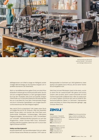 BEST OF Surselva %u2013 Flims %u2013 Laax BEST OF Portrait xxx 872Adresse: Zinsli Eisenwaren + Haushalt AG Landsgemeindeplatz 6, 7130 IlanzTelefon: +41 81 920 03 33E-Mail: info@zinsli-ilanz.chWeb: www.zinsli-ilanz.chTochterfi rma: saddles-tack.ch AGLandsgemeindeplatz 6, 7130 IlanzTelefon: +41 79 858 02 77E-Mail: info@saddles-tack.chWeb: www.saddles-tack.chIn K%u00fcrze: Was als Eisenwarenhandlung begann, ist heute ein vielseitiges Fachgesch%u00e4ft mit Herz und einem Gesp%u00fcr f%u00fcr zeitgem%u00e4sse L%u00f6sungen.Kaffeegeniesser und t%u00fcftelt so lange am Mahlgrad und der richtigen Bohnenmenge, bis der Espresso langsam und in perfekter Harmonie in die Tasse fliesst.Nicht nur bei Kaffeemaschinen geben Zinsli und seine Mitarbeitenden ihr Wissen gerne an die Kundschaft weiter. Service wird am Landsgemeindeplatz 6 in Ilanz grossgeschrieben. Auch bei den Produkten setzt Zinsli auf Qualit%u00e4t. Entsprechend fi nden sich im Sortiment bekannte internationale Marken von A wie Alessi bis Z wie Zalto. Internationales Design wird durch %u00abSchweizer Spezialit%u00e4ten%u00bb wie Carigiet-Geschirr und Accessoires aus der Glasi Hergiswil erg%u00e4nzt.Was macht Zinsli so besonders? %u00abWir bieten einen Rundum-Sorglos-Service f%u00fcr Ihr Zuhause.%u00bb %u00dcber den Haushaltsbedarf hinaus liefert und montiert das Zinsli-Team auch Gartenm%u00f6bel, Briefk%u00e4sten, Schliessanlagen, M%u00e4hroboter, Fliegenschutzgitter, Sonnenschirme, Grills, Schneefr%u00e4sen und -schaufeln. %u00abSelbstverst%u00e4ndlich gravieren wir auch das Klingelschild%u00bb, erkl%u00e4rt Christian-Peter Zinsli. Schliesslich soll alles ordentlich aussehen, damit man sich in und um das eigene Zuhause wohl f%u00fchlt.Hobby zum Beruf gemachtApropos Wohlf%u00fchlen: Der Gesch%u00e4ftsinhaber f%u00fchlt sich selbst auf dem R%u00fccken eines Pferdes am wohlsten. 1997 nahm er Reitsportartikel ins Sortiment auf, 2023 gliederte er diese Sparte in die saddles-tack.ch AG aus, die von seiner Tochter Nina Zinsli gef%u00fchrt wird.Geht Zinsli mit dem Pferdesport %u00abback to the roots%u00bb, zur%u00fcck zu einem Teil der Landwirtschaft? %u00abWir gehen nicht zur%u00fcck, sondern stets vorw%u00e4rts, damit unsere Kundschaft von technischen Fortschritten profi tieren kann. Aber wir wissen auch um unsere Tradition und f%u00fchren nach wie vor Artikel f%u00fcr den landwirtschaftlichen Bedarf im Sortiment. Interessanterweise sind diese im Online-Shop besonders gefragt%u00bb, sagt Christian-Peter Zinsli.Bei Zinsli fi ndet man alles f%u00fcr den modernen Haushalt %u2013 unter anderem auch Siebtr%u00e4ger-Kaffeemaschinen.