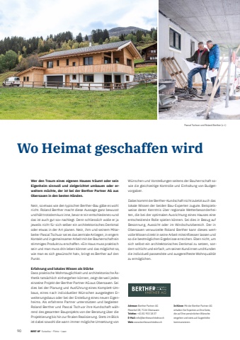 901 BEST OF BEST OF Portrait xxx Surselva %u2013 Flims %u2013 LaaxWo Heimat geschaffen wirdAdresse: Berther Partner AGMeierhof 28, 7134 ObersaxenTelefon: +41 81 933 18 37E-Mail: info@bertherarchitektur.chWeb: www.bertherarchitektur.chIn K%u00fcrze: Mit der Berther Partner AG erhalten Sie Experten an Ihre Seite, die auf Ihre pers%u00f6nlichen W%u00fcnsche eingehen und stets auf Augenh%u00f6he kommunizieren.Wer den Traum eines eigenen Hauses tr%u00e4umt oder sein Eigenheim sinnvoll und zielgerichtet umbauen oder erweitern m%u00f6chte, der ist bei der Berther Partner AG aus Obersaxen in den besten H%u00e4nden. Nein, so etwas wie den typischen Berther-Bau g%u00e4be es wohl nicht. Roland Berther macht diese Aussage ganz bewusst und h%u00e4lt trotzdem kurz inne, bevor er ein entschiedenes %u00abund das ist auch gut so%u00bb nachlegt. Denn schliesslich wolle er ja jeweils nicht f%u00fcr sich selber ein architektonisches Denkmal oder etwas in der Art planen. Nein, ihm und seinem Mitarbeiter Pascal Tschuor sei es das zentrale Anliegen, in engem Kontakt und in gemeinsamer Arbeit mit der Bauherrschaft ein stimmiges Produkt zu erschaffen. %u00abEin Haus muss praktisch sein und man muss drin leben k%u00f6nnen und das m%u00f6glichst so, wie man es sich gew%u00fcnscht hat%u00bb, bringt es Berther auf den Punkt.Erfahrung und lokales Wissen als St%u00e4rkeDass praktische Wohntauglichkeit und architektonische %u00c4sthetik tats%u00e4chlich einhergehen k%u00f6nnen, zeigt derweil jedes einzelne Projekt der Berther Partner AG aus Obersaxen. Sei dies bei der Planung und Ausf%u00fchrung eines Komplett-Umbaus, eines nach individuellen W%u00fcnschen ausgelegten Erweiterungsbaus oder bei der Erstellung eines neuen Eigenheims. Als erfahrene Partner unterst%u00fctzen und begleiten Roland Berther und Pascal Tschuor ihre Kundschaft w%u00e4hrend des gesamten Bauprojekts von der Beratung %u00fcber die Projektierung bis hin zur fi nalen Realisierung. Stets im Blick ist dabei sowohl die wann immer m%u00f6gliche Umsetzung von W%u00fcnschen und Vorstellungen seitens der Bauherrschaft sowie die gleichzeitige Kontrolle und Einhaltung von Budgetvorgaben. Dabei kommt der Berther-Kundschaft nicht zuletzt auch das lokale Wissen der beiden Bau-Experten zugute. Beispielsweise deren Kenntnis %u00fcber regionale Wetterbesonderheiten, die bei der optimalen Ausrichtung eines Hauses eine entscheidende Rolle spielen k%u00f6nnen. Sei dies in Bezug auf Besonnung, Aussicht oder im Windschutzbereich. Der in Obersaxen verwurzelte Roland Berther kann dieses wertvolle Wissen direkt in seine Arbeit miteinfliessen lassen und so die bestm%u00f6glichen Ergebnisse erreichen. Eben nicht, um sich selbst ein architektonisches Denkmal zu setzen, sondern schlicht und einfach, um seinen Kundinnen und Kunden die individuell passendste und ausgereifteste Wohnqualit%u00e4t zu erm%u00f6glichen.Pascal Tschuor und Roland Berther (v. l.)