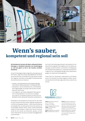 921 BEST OF BEST OF Portrait xxx Surselva %u2013 Flims %u2013 Laax Wenn%u2019s sauber, kompetent und regional sein sollAdresse: Kanalservice Surselva AGIsla 37, 7151 SchlueinVia Igniu 6, 7172 RabiusVia Punt la Reisga 6, 7017 Flims DorfTelefon: +41 81 926 60 60,+41 79 927 60 60E-Mail: info@kanalservice-surselva.chWeb: www.kanalservice-surselva.chIn K%u00fcrze: Pers%u00f6nlich, kompetent und nah an den Menschen vor Ort. Die Kanalservice Surselva AG bietet einen flexiblen Service, auf den sich Gemeinden, Unternehmen und Privatpersonen in der Region verlassen k%u00f6nnen. Mit einem bestens geschulten Team, modernster Technik und regionaler Verankerung sind wir genau dort im Einsatz, wo wir gebraucht werden.Die Kanalservice Surselva AG bietet umfassende Dienstleistungen in s%u00e4mtlichen Bereichen der Kanalreinigung an. Und das gleich an drei in der Surselva verteilten Standorten.%u00abUnser Firmenslogan bringt es eigentlich schon ganz gut auf den Punkt%u00bb, sagt Yves Conrad, Gesch%u00e4ftsf%u00fchrer der Kanalservice Surselva AG. Und tats%u00e4chlich bringt %u00abSauber. Kompetent. Regional.%u00bb die Werte und die t%u00e4gliche Arbeitsweise des Unternehmens klar zum Ausdruck.%u2022 %u00abSauber%u00bb, weil Sauberkeit bei einem Kanalreinigungsunternehmen selbstverst%u00e4ndlich im Mittelpunkt steht.%u2022 %u00abKompetent%u00bb, weil die Mitarbeiterinnen und Mitarbeiter dank regelm%u00e4ssiger Schulungen stets auf dem neusten Stand der Technik sind.%u2022 Und %u00abregional%u00bb, weil dieses eingespielte Team gemeinsam mit Gesch%u00e4ftsf%u00fchrer Yves Conrad in der Region verwurzelt ist, sich bestens auskennt und dank der drei Standorte immer nah bei den Kundinnen und Kunden ist.Entstanden ist die Kanalservice Surselva AG im Jahr 2021 aus dem Zusammenschluss dreier regionaler Kanalserviceund Fl%u00e4chenreinigungs-Anbietern. %u00abDank dieser B%u00fcndelung an Kompetenzen und technischem Know-how k%u00f6nnen wir die Synergien optimal nutzen, wovon unsere Kundschaft wiederum direkt profi tiert%u00bb, erkl%u00e4rt Yves Conrad. Eine Kundschaft, die sich sowohl aus Gemeinden, grossen und kleineren Unternehmen als auch aus privaten Auftraggebenden zusammensetzt.Auch beim Dienstleistungsumfang ist die Kanalservice Surselva AG breit aufgestellt. Das Angebot reicht vom Sp%u00fclen von Leitungen und dem Entleeren von Sch%u00e4chten und Kl%u00e4rgruben %u00fcber Kanalfernsehinspektionen und grabenlose Kanalsanierungen bis hin zu Dichtheitspr%u00fcfungen sowie Fl%u00e4chenreinigungen mit modernster Fahrzeugtechnik.%u00abUnser Ziel ist es, Gemeinden, Unternehmen und Privatpersonen in der Surselva ein breites Angebot zu bieten, das wir individuell auf ihre Anforderungen abstimmen%u00bb, betont Yves Conrad.