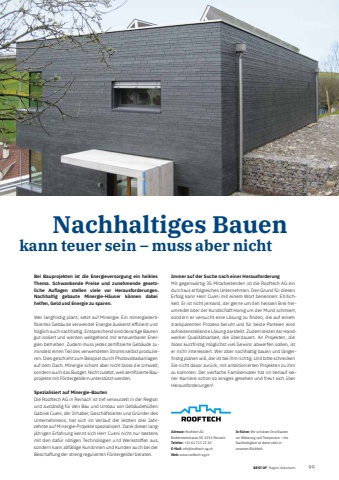 BEST OFBEST OF Region Arlesheim Portrait xxx 991 Nachhaltiges Bauen kann teuer sein %u2013 muss aber nichtAdresse: Rooftech AGBodenmattstrasse 30, 4153 ReinachTelefon: +41 61 713 22 10E-Mail: info@rooftech-ag.chWeb: www.rooftech-ag.chIn K%u00fcrze: Wir sch%u00fctzen Ihre Bauten vor Witterung und Temperatur %u2013 die Nachhaltigkeit ist dabei stets in unserem Blickfeld.Bei Bauprojekten ist die Energie versorgung ein heikles Thema. Schwankende Preise und zunehmende gesetzliche Auflagen stellen viele vor Herausforderungen. Nachhaltig gebaute Minergie-H%u00e4user k%u00f6nnen dabei helfen, Geld und Energie zu sparen. Wer langfristig plant, setzt auf Minergie. Ein minergiezertifi ziertes Geb%u00e4ude ver wendet Energie %u00e4usserst effi zient und folglich auch nachhaltig. Entsprechend sind derartige Bauten gut isoliert und werden weitgehend mit erneuerbaren Energien betrieben. Zudem muss jedes zertifi zierte Geb%u00e4ude zumindest einen Teil des verwendeten Stroms selbst produzieren. Dies geschieht zum Beispiel durch Photovoltaik anlagen auf dem Dach. Minergie schont aber nicht bloss die Umwelt, sondern auch das Budget. Nicht zuletzt, weil zertifi zierte Bauprojekte mit F%u00f6rdergeldern unterst%u00fctzt werden. Spezialisiert auf Minergie-BautenDie Rooftech AG in Reinach ist tief verwurzelt in der Region und zust%u00e4ndig f%u00fcr den Bau und Umbau von Geb%u00e4udeh%u00fcllen. Gabriel Cueni, der Inhaber, Gesch%u00e4ftsleiter und Gr%u00fcnder des Unternehmens, hat sich im Verlauf der letzten drei Jahrzehnte auf Minergie-Projekte spezialisiert. Dank dieser langj%u00e4hrigen Erfahrung kennt sich Herr Cueni nicht nur bestens mit den daf%u00fcr n%u00f6tigen Technologien und Werkstoffen aus, sondern kann allf%u00e4llige Kundinnen und Kunden auch bei der Beschaffung der streng regulierten F%u00f6rdergelder beraten. Immer auf der Suche nach einer HerausforderungMit gegenw%u00e4rtig 35 Mitarbeitenden ist die Rooftech AG ein durchaus erfolgreiches Unternehmen. Den Grund f%u00fcr diesen Erfolg kann Herr Cueni mit einem Wort benennen: Ehrlichkeit. Er ist nicht jemand, der gerne um den heissen Brei herumredet oder der Kundschaft Honig um den Mund schmiert, sondern er versucht eine L%u00f6sung zu fi nden, die auf einem transparenten Prozess beruht und f%u00fcr beide Parteien eine zufriedenstellende L%u00f6sung darstellt. Zudem leistet der Handwerker Qualit%u00e4tsarbeit, die %u00fcberdauert. An Projekten, die bloss kurzfristig m%u00f6glichst viel Gewinn abwerfen sollen, ist er nicht interessiert. Wer aber nachhaltig bauen und l%u00e4ngerfristig planen will, der ist bei ihm richtig. Und bitte schrecken Sie nicht davor zur%u00fcck, mit ambitionierten Projekten zu ihm zu kommen. Der vierfache Familienvater hat im Verlauf seiner Karriere schon so einiges gesehen und freut sich %u00fcber Herausforderungen!