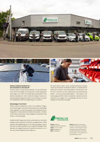 BEST OFBEST OF Region Arlesheim Portrait xxx 1032Adresse: Froglux AGDuggingerstrasse 24, 4153 ReinachTelefon: +41 61 715 90 40E-Mail: info@froglux.chWeb: www.froglux.chIn K%u00fcrze: Froglux ist ein innovatives Unternehmen aus Reinach, spezialisiert auf Elektro- und Solaranlagen. Die Jungunternehmer setzen auf Kundenn%u00e4he, schnelle Reaktionszeiten und nachhaltige Technologien %u2013 f%u00fcr eine effi ziente und umweltfreundliche Zukunft.Moderne Elektroinstallationen %u2013 eine Investition in die ZukunftRrustem Zeqiri, Hauptverantwortlicher f%u00fcr den Elektrobereich, kennt die Sorgen der Kundschaft. %u00abViele Hausbesitzende %u00e4rgern sich %u00fcber die f%u00fcnfj%u00e4hrige Kontrollpflicht ihrer Elektroinstallationen. Doch moderne Anlagen m%u00fcssen nur alle zwanzig Jahre gepr%u00fcft werden. Eine Investition in moderne Installationen zahlt sich langfristig aus%u00bb, erkl%u00e4rt er.Solaranlagen: Von A bis ZNeben Elektroinstallationen plant und installiert Froglux auch Solaranlagen. Das Unternehmen bietet das vollst%u00e4ndige Leistungspaket: von der Planung %u00fcber die Installation bis zur Integration in das bestehende elektrische System. %u00abAndere Unternehmen %u00fcberlassen diese Aufgabe oft separaten Elektrikern%u00bb, so Eichenberger.Zus%u00e4tzlich l%u00e4dt Froglux Kundinnen und Kunden ein, ihre Solaranlage vorab am Standort in Reinach zu begutachten. %u00abViele nehmen das Angebot gerne an. So wissen sie genau, wie es bei ihnen zu Hause aussehen wird%u00bb, sagt Eichenberger. %u00dcber aktuelle und abgeschlossende Projekte informieren wir immer auf unserer Webseite www.froglux.ch.Mit einer klaren Vision, einer kundenorientierten Arbeitsweise und innovativen Ans%u00e4tzen f%u00fcr Elektro- und Solartechnik setzen die %u00abFr%u00f6sche%u00bb neue Massst%u00e4be in der Branche. Sollten Sie in Zukunft vor einer elektrischen Herausforderung stehen %u2013 sei es privat oder gesch%u00e4ftlich %u2013 oder planen, eine Solaranlage auf Ihrem Dach zu installieren, denken Sie an die %u00abFr%u00f6sche%u00bb von Froglux. Ihr zuverl%u00e4ssiger Partner f%u00fcr nachhaltige und innovative L%u00f6sungen!