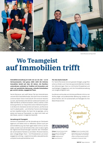 BEST OFBEST OF Region Arlesheim Portrait xxx 1071 Wo Teamgeist auf Immobilien trifftAdresse: Unimmo Partners GmbHBaselstrasse 21, 4153 ReinachTelefon: +41 61 713 83 80 E-Mail: info@unimmo.chWeb: www.unimmo.chIn K%u00fcrze: Unimmo Immobilien GmbH bleibt Reinach treu: Der neue Standort liegt nur wenige Meter vom bisherigen entfernt und bietet weiterhin beste Erreichbarkeit im Herzen der Stadt.Immobilienverwaltung ist mehr als nur ein Job %u2013 es ist Vertrauenssache. Und genau daf%u00fcr steht die Unimmo Immobilien GmbH seit %u00fcber 20 Jahren. Als Familienunternehmen verbindet es Tradition mit Innovation und setzt auf pers%u00f6nliche Betreuung, schnelle Entscheidungen und ein starkes, engagiertes Team.Yannik Monnerat, seit zw%u00f6lf Jahren Teil des Unternehmens und seit 2021 Gesch%u00e4ftsinhaber, f%u00fchrt die Firma mit Herzblut und einer klaren Vision in die Zukunft. Ihm ist es ein Herzenswunsch, das Familienunternehmen weiterzuentwickeln und dabei die Werte, auf denen es basiert, stets zu wahren. Unterst%u00fctzung erh%u00e4lt er von Tanja Imhof, einer erfahrenen Expertin in der Branche. Die beiden lernten sich kennen, als Monnerat noch Fussball spielte %u2013 und Imhof als Trainerin die Strategie auf dem Spielfeld leitete. Der Sport hat sie gepr%u00e4gt, und so setzen sie heute auf Teamarbeit, nur eben nicht mehr auf dem Rasen, sondern im t%u00e4glichen Gesch%u00e4ft.Verwaltung mit TeamgeistUnimmo ist spezialisiert auf die Verwaltung von Stockwerkeigentum und bietet nicht nur effi ziente, sondern auch pers%u00f6nliche Betreuung. Das Team agiert dabei nicht nur als Verwalter, sondern auch als Schiedsrichter, wenn es darum geht, bei Eigent%u00fcmerversammlungen zwischen den Interessen der verschiedenen Parteien zu vermitteln. Mit einem kleinen, aber schlagkr%u00e4ftigen Team %u2013 f%u00fcnf Mitarbeitende und einem engagierten Lehrling %u2013 sorgt Unimmo daf%u00fcr, dass jede Kundin und jeder Kunde optimal betreut wird.Yannik Monnerat und Tanja ImhofF%u00fcr eine starke ZukunftF%u00fcr Yannik Monnerat ist es ein grosses Anliegen, junge Menschen zu f%u00f6rdern und ihnen die spannende Welt der Immobilien n%u00e4herzubringen. Denn nur mit frischen Perspektiven und nachhaltigem Engagement wird die Immobilienverwaltung von morgen erfolgreich sein. Kundinnen und Kunden von Unimmo profi tieren nicht nur von fachkundiger und professioneller Betreuung, sondern von einem Partner, der mit Leidenschaft und Teamgeist f%u00fcr ihre Bed%u00fcrfnisse eintritt.Gewohnt gut!