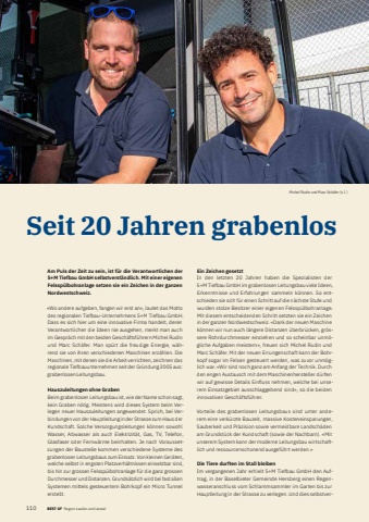 110 BEST OF BEST OF Region Laufen und Liestal Portrait xxxSeit 20 Jahren grabenlosAm Puls der Zeit zu sein, ist f%u00fcr die Verantwortlichen der S+M Tiefbau GmbH selbstverst%u00e4ndlich. Mit einer eigenen Felssp%u00fclbohranlage setzen sie ein Zeichen in der ganzen Nordwestschweiz.%u00abWo andere aufgeben, fangen wir erst an%u00bb, lautet das Motto des regionalen Tiefbau-Unternehmens S+M Tiefbau GmbH. Dass es sich hier um eine innovative Firma handelt, deren Verantwortlichen die Ideen nie ausgehen, merkt man auch im Gespr%u00e4ch mit den beiden Gesch%u00e4ftsf%u00fchrern Michel Rudin und Marc Sch%u00e4fer. Man sp%u00fcrt die freudige Energie, w%u00e4hrend sie von ihren verschiedenen Maschinen erz%u00e4hlen. Die Maschinen, mit denen sie die Arbeit verrichten, zeichnen das regionale Tiefbauunternehmen seit der Gr%u00fcndung 2005 aus: grabenlosen Leitungsbau.Hauszuleitungen ohne GrabenBeim grabenlosen Leitungsbau ist, wie der Name schon sagt, kein Graben n%u00f6tig. Meistens wird dieses System beim Verlegen neuer Hauszuleitungen angewendet. Sprich, bei Verbindungen von der Hauptleitung in der Strasse zum Haus der Kundschaft. Solche Versorgungsleitungen k%u00f6nnen sowohl Wasser, Abwasser als auch Elektri zit%u00e4t, Gas, TV, Telefon, Glasfaser oder Fernw%u00e4rme beinhalten. Je nach Voraussetzungen der Baustelle kommen verschiedene Systeme des grabenlosen Leitungsbaus zum Einsatz. Von kleinen Ger%u00e4ten, welche selbst in engsten Platzverh%u00e4ltnissen einsetzbar sind, bis hin zur grossen Felssp%u00fclbohranlage f%u00fcr die ganz grossen Durchmesser und Distanzen. Grund s%u00e4tzlich wird bei fast allen Systemen mittels gesteuertem Bohrkopf ein Micro Tunnel erstellt. Michel Rudin und Marc Sch%u00e4fer (v. l. )Ein Zeichen gesetztIn den letzten 20 Jahren haben die Spezialisten der S+M Tiefbau GmbH im grabenlosen Leitungsbau viele Ideen, Erkenntnisse und Erfahrungen sammeln k%u00f6nnen. So entschieden sie sich f%u00fcr einen Schritt auf die n%u00e4chste Stufe und wurden stolze Besitzer einer eigenen Felssp%u00fclbohranlage. Mit diesem entscheidenden Schritt setzten sie ein Zeichen in der ganzen Nordwestschweiz. %u00abDank der neuen Maschine k%u00f6nnen wir nun auch l%u00e4ngere Distanzen %u00fcberbr%u00fccken, gr%u00f6ssere Rohrdurchmesser einziehen und so scheinbar unm%u00f6gliche Aufgaben meistern%u00bb, freuen sich Michel Rudin und Marc Sch%u00e4fer. Mit der neuen Errungenschaft kann der Bohrkopf sogar im Felsen gesteuert werden, was zuvor unm%u00f6glich war. %u00abWir sind noch ganz am Anfang der Technik. Durch den engen Austausch mit dem Maschinenhersteller d%u00fcrfen wir auf gewisse Details Einfluss nehmen, welche bei unserem Einsatzgebiet ausschlaggebend sind%u00bb, so die beiden innovativen Gesch%u00e4ftsf%u00fchrer.Vorteile des grabenlosen Leitungsbaus sind unter anderem eine verk%u00fcrzte Bauzeit, massive Kosteneinsparungen, Sauberkeit und Pr%u00e4zision sowie vermeidbare Landsch%u00e4den am Grundst%u00fcck der Kundschaft (sowie der Nachbarn). %u00abMit unserem System kann der moderne Leitungsbau wirtschaftlich und ressourcenschonend ausgef%u00fchrt werden.%u00bb Die Tiere durften im Stall bleibenIm vergangenen Jahr erhielt S+M Tiefbau GmbH den Auftrag, in der Baselbieter Gemeinde Hersberg einen Regenwasseranschluss vom Schlammsammler im Garten bis zur Hauptleitung in der Strasse zu verlegen. Und dies selbstver-