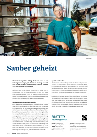 112 BEST OF BEST OF Region Laufen und Liestal Portrait xxxAim%u00e9 BlatterSauber geheiztAdresse: HT Blatter GmbHErzenbergstrasse 11, 4410 LiestalTelefon: +41 61 511 25 75E-Mail: info@blatter-heizung.chWeb: www.blatter-heizung.chIn K%u00fcrze: HT Blatter GmbH ist der Heizungsspezialist in Liestal, der seiner Kundschaft bei Heizungssanierungen mit Rat und Tat und einem schlagkr%u00e4ftigen Team zur Seite steht.Blatter-Heizung ist die richtige Partnerin, wenn es um Heizungssanierungen geht. Wenn die Heizung erneuert wird, ist dies nicht nur ein fi nanzieller Aufwand, sondern auch eine wichtige Entscheidung.Denn mit dem neuen System sollte man f%u00fcr einige Zeit zufrieden sein, und es sollte reibungslos laufen. Seit 2009 erleichtert die Liestaler Firma HT Blatter GmbH Privathaushalten, Architekturb%u00fcros und Immobilienverwaltungen die Planung, den Einbau und die Wartung von Heizungen.Kompetenzzentrum an HandwerkernAim%u00e9 Blatter hat das Unternehmen 2009 gegr%u00fcndet und bewegt sich schon l%u00e4nger in der Branche. Er ist froh, ein schlagkr%u00e4ftiges Umfeld an kompetenten Handwerksbetrieben um sich zu haben: G%u00e4rtner, Maurer, Elektriker, Plattenleger, Maler %u2026 Je nach Sanierung braucht es neben dem Heizungsinstallateur einige Fachleute, die ihren wertvollen Beitrag zu einer reibungslosen, schnellen und sauberen Heizungssanierung leisten. Ob W%u00e4rmepumpe, Holzheizung, Elektroheizung, Gasheizung oder %u00d6lheizung %u2013 f%u00fcr Aim%u00e9 Blatter und sein Team ist das nicht relevant. Der Chef sagt: %u00abDer Kunde ist K%u00f6nig und er entscheidet. Sicher geben wir individuelle Ratschl%u00e4ge und versuchen, unsere Kundschaft bei ihrer Entscheidung zu unterst%u00fctzen. Am Ende braucht es aber einfach W%u00e4rme im Haus. Wie sie genau erzeugt wird, entscheidet die Kundschaft.%u00bbSpeditiv und sauberBlatter steht nicht nur f%u00fcr qualitativ hochstehende, sondern auch f%u00fcr saubere Arbeit. Der Inhaber f%u00fchrt aus: %u00abUnser Motto %u2039sauber geheizt%u203a ist bei uns fest verankert und wird von unseren Mitarbeitenden jeden Tag gelebt. Denn wir fokussieren uns nicht nur auf erneuerbare Heizsysteme, sondern auch auf ordentliche und aufger%u00e4umte Arbeit bei unserer Kundschaft.%u00bbZudem ist es ihm und seinem Team ein Anliegen, schnell auf Kundenw%u00fcnsche zu reagieren. %u00abWenn ein Kunde anruft, hat er zwei Tage sp%u00e4ter einen Termin und weitere zwei Tage sp%u00e4ter die Offerte.%u00bb Im Winter sind wir noch schneller. Aim%u00e9 Blatter und sein Team sorgen daf%u00fcr, dass es ihre Kundschaft immer sch%u00f6n warm hat %u2013 sowohl im Haus als auch ums Herz.