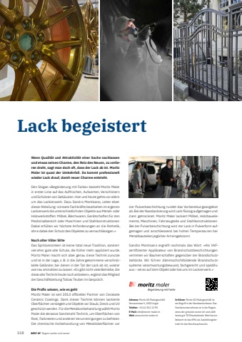 118 BEST OF BEST OF Region Laufen und Liestal Portrait xxxLack begeistertWenn Qualit%u00e4t und Attraktivit%u00e4t einer Sache nachlassen und etwas seinen Charme, den Reiz des Neuen, zu verlieren droht, sagt man doch oft, dass der Lack ab ist. Moritz Maler ist quasi der Umkehrfall. Da kommt professionell wieder Lack drauf, damit neuer Charme entsteht.Den Slogan %u00abBegeisterung mit Farbe%u00bb bezieht Moritz Maler in erster Linie auf das Auffrischen, Aufwerten, Versch%u00f6nern und Sch%u00fctzen von Geb%u00e4uden. Hier und heute gehts vor allem um das Lackierwerk. Dazu Sandro Montisano, Leiter eben dieser Abteilung: %u00abUnsere Fachkr%u00e4fte bearbeiten im eigenen Lackierwerk die unterschiedlichsten Objekte aus Metall- oder Holzwerkstoffen: M%u00f6bel, Blechwaren, Ger%u00e4tschaften f%u00fcr den Medizinalbereich oder Maschinen und Stahlkonstruktionen. Dabei erf%u00fcllen wir h%u00f6chste Anforderungen an die %u00c4sthetik, ohne dabei den Schutz des Objektes zu vernachl%u00e4ssigen.%u00bbNach alter V%u00e4ter SitteDas Spritzverzinken ist keine total neue Tradition, sondern viel eher gute alte Schule, die fr%u00fcher mehr appliziert wurde. Moritz Maler macht sich aber genau diese Technik zunutze und ist in der Lage, z. B. in die Jahre gekommene verschn%u00f6rkelte Gel%u00e4nder, bei denen in der Tat der Lack ab ist, wieder wie neu erstrahlen zu lassen. %u00abEs gibt nicht viele Betriebe, die diese alte Technik heute noch anbieten%u00bb, erg%u00e4nzt das Mitglied der Gesch%u00e4ftsleitung Tobias Teuber im Gespr%u00e4ch.Die Profi s wissen, wie es gehtMoritz Maler ist seit 2013 offi zieller Partner von Cerakote Ceramic Coatings. Dank dieser Technik k%u00f6nnen lackierte Oberfl%u00e4chen versiegelt und Objekte vor Staub, Dreck und UV gesch%u00fctzt werden. F%u00fcr die Metallvorbehandlung w%u00e4hlt Moritz Maler die abrasive Sandstrahl-Technik, um Oberfl%u00e4chen von Rost, Farbresten und anderen Verunreinigungen zu befreien. Die chemische Vorbehandlung von Metalloberfl%u00e4chen vor der Pulverbeschichtung rundet das Vorbereitungsangebot ab. Bei der Nasslackierung wird Lack fl%u00fcssig aufgetragen und dann getrocknet. Moritz Maler lackiert M%u00f6bel, Holzbauelemente, Maschinen, Fahrzeugteile und Stahlkonstruktionen. Bei der Pulverbeschichtung wird der Lack in Pulverform aufgetragen und anschliessend bei hohen Temperaturen bei Metallbauteilen jeglicher Art eingebrannt. Sandro Montisano ergreift nochmals das Wort: %u00abAls VKFzertifi zierter Applikateur von Brandschutzbeschichtungen vertreten wir Bauherrschaften gegen%u00fcber der Brandschutzbeh%u00f6rde. Wir f%u00fchren d%u00e4mmschichtbildende Brandschutzsysteme verantwortungsbewusst, fachgerecht und speditiv aus %u2013 sei es auf dem Objekt oder bei uns im Lackierwerk.%u00bbAdresse: Moritz AG Malergesch%u00e4ft Venusstrasse 5, 4302 AugstTelefon: +41 61 811 12 95E-Mail: info@moritz-maler.chWeb: www.moritz-maler.chIn K%u00fcrze: Moritz AG Malergesch%u00e4ft ist ein Begriff in der Nordwestschweiz. Das Familienunternehmen ist in der Region eines der gr%u00f6ssten seiner Art und z%u00e4hlt heute gut 70 Mitarbeitende. Weit herum bekannt ist das KMU als Ausbildungsbetrieb f%u00fcr den Berufsnachwuchs.