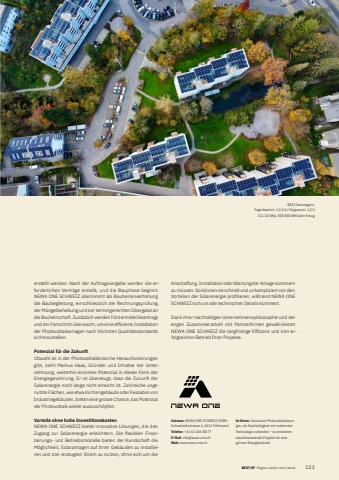BEST OF Region Laufen und Liestal BEST OF Portrait xxx 1232Adresse: NEWA ONE SCHWEIZ GMBHSchneckelerstrasse 4, 4414 F%u00fcllinsdorfTelefon: +41 61 264 88 77E-Mail: info@newa-one.chWeb: www.newa-one.chIn K%u00fcrze: Innovative Photovoltaikl%u00f6sungen, die Nachhaltigkeit mit modernster Technologie verbinden %u2013 so entstehen zukunftsweisende Projekte f%u00fcr eine gr%u00fcnere Energiezukunft.erstellt werden. Nach der Auftragsvergabe werden die erforderlichen Vertr%u00e4ge erstellt, und die Bauphase beginnt. NEWA ONE SCHWEIZ %u00fcbernimmt als Bauherrenvertretung die Baubegleitung, einschliesslich der Rechnungspr%u00fcfung, der M%u00e4ngelbehebung und der termingerechten %u00dcbergabe an die Bauherrschaft. Zus%u00e4tzlich werden F%u00f6rdermittel beantragt und der Fortschritt %u00fcberwacht, um eine effi ziente Installation der Photovoltaikanlagen nach h%u00f6chsten Qualit%u00e4tsstandards sicherzustellen.Potenzial f%u00fcr die ZukunftObwohl es in der Photovoltaikbranche Herausforderungen gibt, sieht Markus Haas, Gr%u00fcnder und Inhaber der Unternehmung, weiterhin enormes Potenzial in dieser Form der Energiegewinnung. Er ist %u00fcberzeugt, dass die Zukunft der Solarenergie noch lange nicht erreicht ist. Zahlreiche ungenutzte Fl%u00e4chen, wie etwa Kirchengeb%u00e4ude oder Fassaden von Industriegeb%u00e4uden, bieten eine grosse Chance, das Potenzial der Photovoltaik weiter auszusch%u00f6pfen.Vorteile ohne hohe InvestitionskostenNEWA ONE SCHWEIZ bietet innovative L%u00f6sungen, die den Zugang zur Solarenergie erleichtern. Die flexiblen Finanzierungs- und Betriebsmodelle bieten der Kundschaft die M%u00f6glichkeit, Solar anlagen auf ihren Geb%u00e4uden zu installieren und den erzeugten Strom zu nutzen, ohne sich um die Anschaffung, Installation oder Wartung der Anlage k%u00fcmmern zu m%u00fcssen. So k%u00f6nnen sie schnell und unkompliziert von den Vorteilen der Solarenergie profi tieren, w%u00e4hrend NEWA ONE SCHWEIZ sich um alle technischen Details k%u00fcmmert.Dank ihrer nachhaltigen Unternehmensphilosophie und der engen Zusammenarbeit mit Partnerfi rmen gew%u00e4hrleistet NEWA ONE SCHWEIZ die langfristige Effi zienz und den erfolgreichen Betrieb Ihrer Projekte.8833 Samstagern, Sagenbachstr. 1,3,5,6 / H%u00fcgsamstr. 1,3,5311.52 kWp, 300 000 kWh/Jahr Ertrag