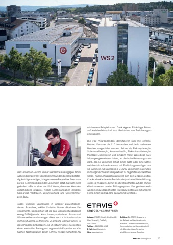 BEST OF BEST OF %u00dcberregional Portrait xxx 112Adresse: ETAVIS Kriegel+Schaffner AGWien-Strasse 2, Postfach, 4002 BaselTelefon: +41 61 316 60 60E-Mail: basel@etavis.chWeb: www.etavis.chIn K%u00fcrze: Die ETAVIS Gruppe ist in der Schweiz und Liechtenstein die Nummer 1 im Bereich Elektrotechnik, Kommunikation und Automationstechnik. Wir unterst%u00fctzen Sie partnerschaftlich mit unserer Expertise.den Lernenden %u2013 schon immer viel Vertrauen entgegen. Noch w%u00e4hrend der Lehrzeit konnte ich im Kundendienst selbstst%u00e4ndig Auftr%u00e4ge erledigen, kriegte %u2039meine%u203a Baustelle%u00bb. Dass man auf die Eigenst%u00e4ndigkeit der Lernenden setzt, hat sich nicht ge%u00e4ndert. %u00abSie ist einer der f%u00fcnf Werte, die unser Handeln entscheidend pr%u00e4gen.%u00bb Neben Eigenst%u00e4ndigkeit geh%u00f6ren Soli darit%u00e4t, Vertrauen, Verantwortung und Unternehmergeist dazu.%u00abAlles wichtige Grunds%u00e4tze in unserer zukunftsorientierten Branche%u00bb, erkl%u00e4rt Christian Matter (Business Development). Beispielhaft ist da das Dienstleistungspaket energy2050@etavis: Kund:innen produzieren Strom und W%u00e4rme selber und managen diese auch %u2013 in Kombination mit Smart-Home- Automation. %u00abLernende werden zentral in diese Projekte einbezogen%u00bb, so Christian Matter. %u00abSie leisten einen wertvollen Beitrag und eignen sich Expertise an.%u00bb In Sachen Nachhaltigkeit gehen ETAVIS Kriegel+Schaffner AG mit bestem Beispiel voran: Dank eigener PV-Anlage, Fokus auf Kreislaufwirtschaft und Reduktion von Treibhausgasemissionen. Die 730 Mitarbeitenden identifi zieren sich mit %u00abihrem%u00bb Betrieb. Darunter die 110 Lernenden, welche in mehreren Berufen ausgebildet werden. Sei es als Elektroplaner/in, Solar installateur/in, Automatiker/in, Elektroinstallateur/in, Montage-Elektriker/in und einigem mehr. Was diese Ausbildungen gemeinsam haben, ist der hohe Betreuungsstandard. Jede/r Lernende erh%u00e4lt einen G%u00f6tti oder eine Gotte, welche sich aufmerksam und mit Einf%u00fchlungsver m%u00f6gen um sie k%u00fcmmern. So wachsen die ETAVIS-Lernenden in Berufen mit ausgezeichneten Perspektiven zu begehrten Fachkr%u00e4ften heran. Nach Lehrabschluss bietet sich den jungen ElektroCracks eine Karriere im Betrieb oder/und eine Weiterbildung. %u00abAlles ist m%u00f6glich%u00bb, bringt es Christian Matter auf den Punkt. %u00abDank unserem dualen Bildungssystem. Das geniesst weltweit einen ausgezeichneten Ruf. Dazu leisten wir mit unserer Firma einen Beitrag. Und darauf sind wir stolz.%u00bb
