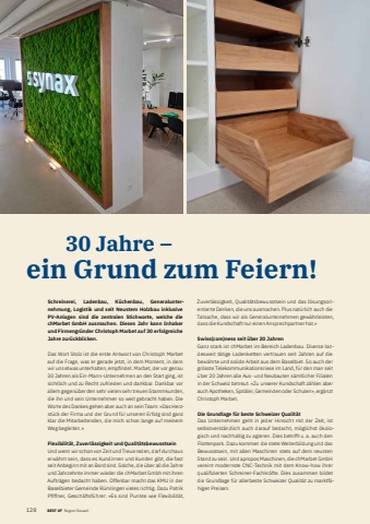 128 BEST OF BEST OF Region Sissach Portrait xxx 30 Jahre %u2013 ein Grund zum Feiern!Schreinerei, Ladenbau, K%u00fcchenbau, Generalunternehm ung, Logistik und seit Neustem Holzbau inklusive PV-Anlagen sind die zentralen Stichworte, welche die chMarbet GmbH ausmachen. Dieses Jahr kann Inhaber und Firmen gr%u00fcnder Christoph Marbet auf 30 erfolgreiche Jahre zur%u00fcckblicken. Das Wort Stolz ist die erste Antwort von Christoph Marbet auf die Frage, was er gerade jetzt, in dem Moment, in dem wir uns etwas unterhalten, empfi ndet. Marbet, der vor genau 30 Jahren als Ein-Mann-Unternehmen an den Start ging, ist sichtlich und zu Recht zufrieden und dankbar. Dankbar vor allem gegen%u00fcber den sehr vielen sehr treuen Stammkunden, die ihn und sein Unternehmen so weit gebracht haben. Die Worte des Dankes gehen aber auch an sein Team: %u00abDas Herzst%u00fcck der Firma und der Grund f%u00fcr unseren Erfolg sind ganz klar die Mitarbeitenden, die mich schon lange auf meinem Weg begleiten.%u00bbFlexibilit%u00e4t, Zuverl%u00e4ssigkeit und Qualit%u00e4tsbewusstseinUnd wenn wir schon von Zeit und Treue reden, darf durchaus erw%u00e4hnt sein, dass es Kundinnen und Kunden gibt, die fast seit Anbeginn mit an Bord sind. Solche, die %u00fcber all die Jahre und Jahrzehnte immer wieder die chMarbet Gmbh mit ihren Auftr%u00e4gen bedacht haben. Offenbar macht das KMU in der Baselbieter Gemeinde R%u00fcmlingen vieles richtig. Dazu Patrik Pfi ffner, Gesch%u00e4ftsf%u00fchrer: %u00abEs sind Punkte wie Flexibilit%u00e4t, Zuverl%u00e4ssigkeit, Qualit%u00e4tsbewusstsein und das l%u00f6sungsorientierte Denken, die uns ausmachen. Plus nat%u00fcrlich auch die Tatsache, dass wir als Generalunternehmen gew%u00e4hrleisten, dass die Kundschaft nur einen Ansprechpartner hat.%u00bbSwiss(com)ness seit %u00fcber 20 JahrenGanz stark ist chMarbet im Bereich Ladenbau. Diverse landesweit t%u00e4tige Ladenketten vertrauen seit Jahren auf die bew%u00e4hrte und solide Arbeit aus dem Baselbiet. So auch der gr%u00f6sste Telekommunikationsriese im Land, f%u00fcr den man seit %u00fcber 20 Jahren alle Aus- und Neubauten s%u00e4mtlicher Filialen in der Schweiz betreut. %u00abZu unserer Kundschaft z%u00e4hlen aber auch Apotheken, Spit%u00e4ler, Gemeinden oder Schulen%u00bb, erg%u00e4nzt Christoph Marbet.Die Grundlage f%u00fcr beste Schweizer Qualit%u00e4tDas Unternehmen geht in jeder Hinsicht mit der Zeit, ist selbstverst%u00e4ndlich auch darauf bedacht, m%u00f6glichst %u00f6kologisch und nachhaltig zu agieren. Dies betrifft u. a. auch den Flottenpark. Dazu kommen die stete Weiterbildung und das Bewusstsein, mit allen Maschinen stets auf dem neusten Stand zu sein. Und apropos Maschinen, die chMarbet GmbH vereint modernste CNC-Technik mit dem Know-how ihrer qualifi zierten Schreiner-Fachkr%u00e4fte. Dies zusammen bildet die Grundlage f%u00fcr allerbeste Schweizer Qualit%u00e4t zu marktf%u00e4higen Preisen.