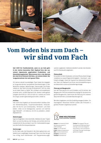 130 BEST OF BEST OF Region Sissach Portrait xxxVom Boden bis zum Dach %u2013 wir sind vom FachAdresse: Erne Holztechnik GmbHAlte Hauensteinstrasse 1A, 4448 L%u00e4ufelfi ngenTelefon: +41 79 760 79 87E-Mail: info@erne-holztechnik.chWeb: www.erne-holztechnik.chInstagram: erneholztechnikFacebook: ErneHolztechnikIn K%u00fcrze: Das engagierte Team der Erne Holztechnik GmbH bietet Dienstleistungen rund um das %u00f6kologische Naturprodukt an. Aber auch Photovoltaik-Anlagen-Planungen und Montagen geh%u00f6ren zum Angebot.Seit 1929 Ihr Familienbetrieb, wenn es um Holz geht. In der vierten Generation f%u00fchrt Raphael Erne den von seinem Urgrossvater gegr%u00fcndeten Produktions- und Dienstleistungsbetrieb. %u00dcbernommen hat er den Betrieb, der einst Erne Zimmerei AG hiess, von seinem Onkel. Der Jungunternehmer hat noch grosse Pl%u00e4ne.Mit seinem aktuell neunk%u00f6pfi gen Team bietet der engagierte Jungunternehmer kompetente Dienstleistungen in den Bereichen Holzbau, Bedachungen, Sanierungen und Photovoltaik an. Das Team ist jung und dynamisch. %u00abIch bin stolz, so ein tolles Team zu haben. Wir sch%u00e4tzen und respektieren einander sehr%u00bb, erz%u00e4hlt Raphael Erne, dessen Lieblingsholz %u00fcbrigens die Eiche ist. %u00abSie ist nicht nur rustikal und sch%u00f6n f%u00fcrs Auge, sondern gleichzeitig auch edel%u00bb, erkl%u00e4rt er.Holzbau Hier reicht das Angebot von konventionellem Holzbau %u00fcber die Elementbauweise, Carports/Unterst%u00e4nde, Anbauten aller Art bis hin zum Innenausbau, Terrassen- und Holzb%u00f6den. %u00abHolz ist ein %u00f6kologischer, warmer und nachhaltiger Rohstoff %u2013 ich liebe es, mit ihm zu arbeiten%u00bb, erkl%u00e4rt Raphael Erne.Bedachungen Egal ob Ziegeldach, Eternitschiefer, Welleternit oder Trapezblech, je nach Kundenwunsch fertigt und montiert die Erne Holztechnik Ihr Wunschdach. Auch f%u00fcr Contecabdichtungen sind die Profi s Ihre Ansprechpartner.Sanierungen Ist Ihr Dach oder die Fassade in die Jahre gekommen und bedarf einer sorgf%u00e4ltigen Sanierung? Dann sind Sie hier genau richtig. Auch Dachfenster- und Treppensanierungen werden angeboten. Selbstverst%u00e4ndlich werden die Arbeiten auch f%u00fcr Neubauten angeboten.Photovoltaik Sie spielen mit dem Gedanken, sich eine Photovoltaik-Anlage installieren zu lassen? Egal ob Schr%u00e4gdach-, Flachdach-, oder Indach-Anlagen. Dank der Sparte Erne Solartechnik bietet das Team von Raphael Erne Ihnen eine Komplettl%u00f6sung an, sie bekommen so eine schl%u00fcsselfertige Anlage.Planung und BaugesucheVon der Planung bis hin zum Erstellen und Einreichen der Baugesuche: Die Erne Holztechnik erledigt f%u00fcr Sie kleine bis grosse Baugesuche, %u00fcbernimmt die Planung mit anderen Bauunternehmern und bietet Bauleitungen an.Bei allen Angeboten wird die Qualit%u00e4t grossgeschrieben. Im hauseigenen Showroom k%u00f6nnen zudem alle Produkte in grossen Mustern angeschaut werden.