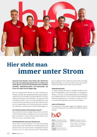 132 BEST OF BEST OF Region Sissach Portrait xxxHier steht man immer unter StromAdresse: b+s elektro telematik agHauptstrasse 183, 4466 OrmalingenTelefon: +41 61 985 97 97E-Mail: info@bs-elektro.chWeb: www.bs-elektro.chInstagram: bs_elektro_telematikFacebook: b+s Elektro Telematik AGIn K%u00fcrze: Energie sparen und smart wohnen? Die b+s elektro telematik ag macht es m%u00f6glich %u2013 mit innovativen L%u00f6sungen f%u00fcr Photovoltaik, Geb%u00e4udeautomation und Beratung.Sie planen einen Neubau, einen Umbau oder m%u00f6chten Ihr Haus oder Ihre Wohnung sanieren? Die b+s elektro telematik ag ist ihr Partner f%u00fcr alle Arbeiten rund um Elektro, Telematik, Geb%u00e4udeautomation und Photovoltaik. Die Firma ist in Basel und der Region t%u00e4tig.Dank der Qualit%u00e4t beim Material und beim Ausf%u00fchren der Arbeiten und dank der kompetenten Beratung und Betreuung hat sich die b+s l%u00e4ngst einen Namen gemacht, nicht nur regional. Roland Gisler, Gesch%u00e4ftsleiter und eidg. dipl. Elektroinstallateur erkl%u00e4rt: %u00abEs ist uns ein grosses Bed%u00fcrfnis, dass wir dem Kunden quasi alles aus erster Hand bieten k%u00f6nnen. Wir sind Ansprechpartner f%u00fcr s%u00e4mtliche Bereiche und bieten auch das Planen und Montieren von Photovoltaikanlagen an.%u00bbSie m%u00f6chten Energie und Stromkosten sparen?Dann sind Sie hier an der richtigen Adresse. Man nimmt sich viel Zeit f%u00fcr Beratungen und zeigt auf, wo und wie man %u00f6kologisch wohnen kann. %u00abAuch die Smart-H%u00e4user werden immer mehr zum Trend%u00bb, weiss Roland Gisler. Die Mitarbeitenden sind unser h%u00f6chstes Gut%u00abUnser Team ist jung, dynamisch und voller Tatendrang%u00bb, erz%u00e4hlt Gisler weiter. Es besteht aus 22 Mitarbeitenden, die allesamt einen Top-Service bieten. Die Digitalisierung hat nat%u00fcrlich auch vor dieser Branche keinen Halt gemacht, ganz im Gegenteil. Darum legt man grossen Wert auf stetige Weiter bildungen, um immer auf dem neusten technischen Stand zu sein, aber auch um die Trends zu kennen.Geb%u00e4udeautomationIn diesem Gebiet bietet die b+s massgeschneiderte L%u00f6sungen f%u00fcr Energieeffi zienz, IoT-Technologien und Zugangskontrolle an, um Privat- und Gesch%u00e4ftskunden bei der Senkung des Energieverbrauchs und der Optimierung des gesamten Geb%u00e4udemanagements zu unterst%u00fctzen. Moderne IT-Kommunikationsl%u00f6sungen gibt es auch f%u00fcr Ihre vier W%u00e4nde.Laden mit Showroom Ein Gesch%u00e4ft mit Showroom erg%u00e4nzt das Angebot. Hier ist man auch richtig, wenn man einfach eine Gl%u00fchbirne kaufen m%u00f6chte.