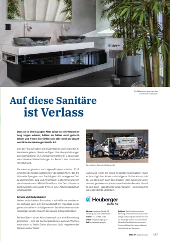BEST OF Region Sissach 1371 Waldhaus Th%u00fcrnen; Holzelementbau Dach und W%u00e4nde, Eternitbedachung2 Primarschulhaus Ettingen; Fassadenverkleidung Eternit3%u2009/%u20094 Dachsanierung in R%u00fcnenberg; Dachaufbaute und Dachfl%u00e4chenfenster5 Autounterstand K%u00e4nerkinden;Bedachung und Holzbau6 Garage Zeglingen; konventioneller Holzbau mit FassadenverkleidungWeitere Infos auf unserer Websitewww.martiholztechnik.chMarti Holztechnik GmbHHauptstrasse 1024441 Th%u00fcrnenTel. 061 973 81 81info@martiholztechnik.chwww.martiholztechnik.ch2 34 56BEST OF Portrait xxx 1Auf diese Sanit%u00e4re ist VerlassDass sie in ihrem jungen Alter schon so viel Verantwortung tragen w%u00fcrden, h%u00e4tten sie fr%u00fcher nicht gedacht. Daniel und Timon Itin f%u00fchlen sich sehr wohl als Verantwortliche der Heuberger Sanit%u00e4r AG.Von der Pike auf haben die Br%u00fcder Daniel und Timon Itin ihr Handwerk gelernt. Beide verf%u00fcgen %u00fcber die Ausbildungen zum Sanit%u00e4rplaner EFZ und Sanit%u00e4rmonteur EFZ sowie %u00fcber verschiedene Weiterbildungen im Bereich der Unternehmensf%u00fchrung. Sie waren es gewohnt, auch eigene Projekte zu leiten. 2019 erhielten die beiden Gelterkinder die Gelegenheit, das traditionelle Spengler- und Sanit%u00e4rgesch%u00e4ft im eigenen Dorf zu %u00fcbernehmen. J%u00fcrg und Annemarie Heuberger gr%u00fcndeten das Unternehmen 1988 als Einzelfi rma. Das Gesch%u00e4ft wuchs kontinuierlich und wurde 1995 in eine Aktiengesellschaft umgewandelt. Service und BadumbautenNeben individuellem Badumbau %u2013 mit Hilfe der modernen 3D-Software kann sich die Kundschaft ihr Traumbad detailgetreu vorstellen %u2013 und allgemeinen Sanit%u00e4rarbeiten wird bei Heuberger Sanit%u00e4r AG auch der Service grossgeschrieben. Bei Notf%u00e4llen %u2013 ob der Ablauf verstopft oder eine Rohrleitung gebrochen %u2013 sind die Sanit%u00e4rspezialisten auch am Wochenende sofort zu Stelle. Damit alles rund l%u00e4uft, respektive das Wasser wieder fliesst.Adresse: Heuberger Sanit%u00e4r AGFabrikweg 5b, 4460 GelterkindenTelefon: +41 61 985 10 80E-Mail: info@heubergerag.chWeb: www.heubergerag.chIn K%u00fcrze: Durch kundenorientierte Beratung, modernste Technik und nachhaltige Ausf%u00fchrung der Arbeiten hat sich die Heuberger Sanit%u00e4r AG zu einem der f%u00fchrenden Sanit%u00e4rbetriebe entwickelt. Timon und Daniel Itin setzen dabei auf hohe Qualit%u00e4t und Teamwork. Daniel und Timon Itin sowie ihr ganzes Team haben Freude an ihrer t%u00e4glichen Arbeit und sind gerne f%u00fcr ihre Kundschaft da. Sie geniessen auch den grossen Team-Geist und unternehmen gerne einmal etwas ausserhalb des Betriebs. So soll es sein, denn %u2013 das ist schon l%u00e4nger bekannt %u2013 eine motivierte Crew kann Berge versetzen.Das motivierte Team der Heuberger AGEin Badezimmer, ganz nach den Tr%u00e4umen der Kundschaft.