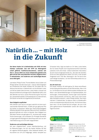 BEST OF BEST OF Region Sissach Portrait xxx 1391Adresse: Hasler Holzbau AGRohrbachweg 2, 4460 GelterkindenTelefon: +41 61 985 40 40E-Mail: info@haslerholzbau.chWeb: www.haslerholzbau.chIn K%u00fcrze: Die Hasler Holzbau AG h%u00e4lt modernste L%u00f6sungen aus dem Baustoff Holz bereit. Man redet nicht nur von Nachhaltigkeit und Energieeinsparungen, man lebt und arbeitet nach diesem Credo. Nat%u00fcrlich %u2026 %u2013 mit Holz in die ZukunftNachhaltiger Systemholzbau: der %u00abErgHolz-Park%u00bb in GelterkindenDer Name Hasler ist in Gelterkinden seit 1925 mit dem Holzbau verbunden. Das seit 1979 als Aktiengesellschaft gef%u00fchrte Traditionsunternehmen, welches seit dem 1.%u00a0Januar 2023 von neuen Inhabenden geleitet wird, geht mit der Zeit und pr%u00e4sentiert mit dem %u00abErgHolz-Park%u00bb in Gelterkinden, wie modernes und nachhaltiges Bauen anno 2023 geht.Lea Hasler, Philipp Fricker, Thomas Weibel, Armin Gubler und Philipp Gerber sind die neuen per 1. Januar 2023 eingesetzten Inhabenden der Hasler Holzbau AG. Sie haben das Traditionsunternehmen in Gelterkinden von den Br%u00fcdern Lukas und Adrian Hasler %u00fcbernommen. Lukas Hasler, so etwas wie das personifi zierte Aush%u00e4ngeschild im Baselbieter KMU, wird dem Betrieb noch bis zu seiner Pensionierung die Treue halten. Gesamthaft arbeiten 22 Mitarbeitende im Unternehmen, f%u00fcnf davon Lernende und angehende Zimmerleute.Dem Zeitgeist verpflichtet%u00abWir arbeiten nach wie vor und ganz nat%u00fcrlich mit dem nachwachsenden Rohstoff Holz%u00bb, erz%u00e4hlt der gut gelaunte Philipp Gerber im Gespr%u00e4ch. Wobei das Thema Nachhaltigkeit selbstverst%u00e4ndlich einen grossen Platz einnimmt. Das Bauen generell befi ndet sich stark im Wandel. Dem Zeitgeist verpflichtete Themen wie geringerer CO2-Ausstoss oder energetische Sanierungen, das Umsetzen von Minergie-Standards und ganz generell %u00f6kologische Gesichtspunkte sind von zentraler Bedeutung und nicht mehr wegzudenken.Modernes und nachhaltiges WohnenMit dem %u00abErgHolz-Park%u00bb, einem Mehrfamilienhaus mit 16 Mietwohnungen, hat sich die Hasler Holzbau AG fast ein eigenes Denkmal gesetzt. %u00abDas Geb%u00e4ude besteht, mit Ausnahme von Lift und Tiefgarage, nahezu komplett aus Schweizer Holz%u00bb, f%u00fcgt Lea Hasler an. Ihr Vater, Lukas Hasler, der f%u00fcr dieses Projekt noch hauptverantwortlich zeichnete, pr%u00e4zisiert nicht ohne Stolz: %u00abJeder Kubikmeter Holz bedeutet eine Tonne eingespeichertes CO2, das %u00fcber die n%u00e4chsten 50 bis 60 Jahre gespeichert bleibt und nicht in die Umwelt freigesetzt wird.%u00bb Der Bau %u00fcberzeugt in der Tat durch eine nachhaltige Konzeption, von der Elementbauweise bis zur Photovol taikanlage.Aus alt mach neuDie Hasler Holzbau AG steht genau f%u00fcr diese zukunftsweisende Holzsystembauweise und den Elementbau. Aber nicht nur. Im Portfolio hat sie auch allerlei andere Holzbauten wie Wand- oder Deckenbekleidungen mit Gipsfaserplatten, Aufstockungen, Innenausbauten, Sanierungen sowie Dachdeckerei, Dachunterhalt und Service. %u00abMan muss nicht immer alles komplett erneuern%u00bb, weiss Philipp Gerber. Das Unternehmen in Gelterkinden ist ebenso stark im Wiederauffrischen von bestehenden Wohn(t)r%u00e4umen. Als Stichwort dazu kann man z. B. den Schleif-Service anf%u00fcgen, der aus in die Jahre gekommenen Parkettb%u00f6den wieder den Glanz alter Tage hervorholt.