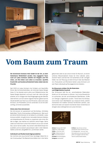 BEST OFBEST OF Region Waldenburg Portrait xxx 141Vom Baum zum TraumDie Schreinerei Ammann Holz GmbH ist der Ort, an dem Holztr%u00e4ume Wirklichkeit werden. Das engagierte Team rund um Lukas Ammann arbeitet mit Hingabe und Pr%u00e4zision, um Ihre Ideen zum Leben zu erwecken. Qualit%u00e4t, Kreativit%u00e4t und Kundenzufriedenheit haben dabei oberste Priorit%u00e4t.Seit 2023 ist Lukas Ammann der Inhaber und Gesch%u00e4ftsf%u00fchrer des Schreinerbetriebes, der ehemals Sasse-Design hiess. Er hat damals seine Lehre zum M%u00f6belschreiner bei Sasse- Design absolviert und auch nach der Lehre dort gearbeitet, bis er infolge einer Nachfolgeregelung den Betrieb %u00fcber nehmen und ihm seinen eigenen Namen geben konnte. Heute besteht das Team aus drei Personen, dies sind Lukas Ammann, ein Mitarbeiter und ein Lernender. Es ist ihm sehr wichtig, Lernende auszubilden. Kleine aber feine SchreinereiDie Schreinerei ist spezialisiert auf K%u00fcchenbau, Schr%u00e4nke, Badm%u00f6bel, Tische, Innenausbau und Reparaturen. Aber auch als kleine Dorfschreinerei ist sie bekannt und beliebt. Lukas Ammann erkl%u00e4rt: %u00abEs gibt immer mal wieder kleinere Arbeiten, wie beispielsweise ein Fenster zu reparieren oder einen Boden zu legen, das machen wir nat%u00fcrlich, keine Frage.%u00bb Seine Liebe zum Holz hat er schon fr%u00fch erkannt und so war schnell klar, was er lernen wollte. %u00abAus einem rohen Brett etwas herzustellen und es danach anzuschauen oder in den H%u00e4nden halten zu k%u00f6nnen, das gef%u00e4llt mir%u00bb, so Ammann weiter. Individuell und flexibel dank Eigenproduktion Sie m%u00f6chten eine neue K%u00fcche? Oder ben%u00f6tigen Ideen f%u00fcr einen Innenausbau? Die Badezimmerm%u00f6bel sind in die Jahre gekommen oder es war schon immer Ihr Wunsch, an einem sch%u00f6nen Massivholztisch Essen f%u00fcr Ihre Liebsten aufzutischen? Dann sind Sie hier mit Sicherheit an der richtigen Stelle. Von der Planung und dem Entwurf %u00fcber das Realisieren, Produzieren und Montieren bieten Lukas Ammann und sein Team individuell auf Sie abgestimmte Arbeiten. Im Showroom erleben Sie die Materialen und M%u00f6glichkeiten hautnahDer Showroom l%u00e4dt Sie ein, verschiedenste Materialien direkt vor Ort anschauen zu k%u00f6nnen. Auch eine Showk%u00fcche ist vorhanden, bei der verschiedenste Oberfl%u00e4chen, Griffe und Designs angebracht wurden. Trend beim K%u00fcchenbau sind immer noch Oberfl%u00e4chen aus massiver Eiche, welche momentan mit mattem Schwarz kombiniert werden, was die K%u00fcche edel und stylisch erscheinen l%u00e4sst. Eichenholz ist %u00fcbrigens das Lieblingsholz von Lukas Ammann. Adresse: Ammann Holz GmbHS%u00e4gegasse 2, 4207 BretzwilTelefon: +41 61 941 20 92E-Mail: info@ammanholz.chWeb: www.ammannholz.chFacebook: ammannholzgmbhInstagram: ammannholzIn K%u00fcrze: Lukas Amman und sein kompetentes Team schreinern f%u00fcr Sie Ihr Lieblingsm%u00f6bel %u2013 sei es ein Tisch, Kleinm%u00f6bel oder eine neue K%u00fcche. Kompetent und engagiert steht das kleine Team f%u00fcr professionelle Arbeiten.