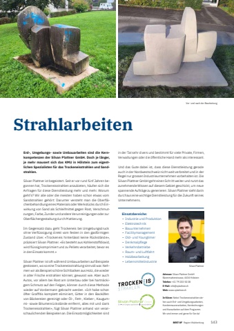 BEST OFBEST OF Region Waldenburg Portrait xxx 1431StrahlarbeitenAdresse: Silvan Plattner GmbHB%u00e4renmattenstrasse, 4434 H%u00f6lsteinTelefon: +41 79 203 50 38E-Mail: info@splattner.chWeb: www.splattner.chIn K%u00fcrze: Nebst Trockeneisstrahlen stehen auch Erd- und Umgebungsarbeiten, Kundenmaurerarbeiten, Kernbohrungen und Kranarbeiten auf dem Programm. Wir sind immer und gerne f%u00fcr Sie da!Erd-, Umgebungs- sowie Umbauarbeiten sind die Kernkompetenzen der Silvan Plattner GmbH. Doch je l%u00e4nger, je mehr mausert sich das KMU in H%u00f6lstein zum eigentlichen Spezialisten f%u00fcr das Trockeneisstrahlen und Sandstrahlen.Silvan Plattner ist begeistert. Seit er vor rund f%u00fcnf Jahren begonnen hat, Trockeneisstrahlen anzubieten, h%u00e4ufen sich die Anfragen f%u00fcr diese Dienstleistung mehr und mehr. Worum geht%u2019s? Wir alle oder die meisten haben schon etwas vom Sandstrahlen geh%u00f6rt: Darunter versteht man die Oberfl%u00e4chenbehandlung eines Materials oder Werkst%u00fccks durch Einwirkung von Sand als Schleifmittel gegen Rost, Verschmutzungen, Farbe, Zunder und andere Verunreinigungen oder zur Oberfl%u00e4chengestaltung durch Mattierung.Im Gegensatz dazu geht Trockeneis bei Umgebungsdruck ohne Verfl%u00fcssigung direkt vom festen in den gasf%u00f6rmigen Zustand %u00fcber. %u00abTrockeneis hinterl%u00e4sst keine R%u00fcckst%u00e4nde%u00bb, pr%u00e4zisiert Silvan Plattner. %u00abEs besteht aus Kohlenstoffdioxid, wird fl%u00fcssig komprimiert und zu Pellets verarbeitet, bevor es in den Einsatz kommt.%u00bbSilvan Plattner ist oft w%u00e4hrend Umbauarbeiten auf Beispiele gestossen, wo so eine Trockeneisstrahlung sinnvoll war. Nehmen wir als Beispiel sch%u00f6ne Sichtbalken aus Holz, die wieder in alter Frische erstrahlen k%u00f6nnen; gewusst wie. Aber auch Autos, vor allem bei Rost am Unterbau oder bei hartn%u00e4ckigem Schmutz auf den Felgen, k%u00f6nnen durch diese Methode wieder auf Vordermann gebracht werden. %u00abIch habe schon %u00f6fter Graffi tis komplett eliminiert, Gitter in den Back%u00f6fen von B%u00e4ckereien gereinigt oder %u00d6l-, Fett-, Kleber-, Kaugummi- sowie Bitumenr%u00fcckst%u00e4nde entfernt, alles mit und dank Trockeneisstrahlen%u00bb, f%u00fcgt Silvan Plattner anhand von veranschaulichenden Beispielen an. Die Einsatzm%u00f6glichkeiten sind in der Tat sehr divers und bestimmt f%u00fcr viele Private, Firmen, Verwaltungen oder die %u00f6ffentliche Hand mehr als interessant.Und das Gute dabei ist, dass diese Dienstleistung gerade auch in der Nordwestschweiz nicht weit verbreitet und in der Regel nur grossen Industrieunternehmen vorbehalten ist. Die Silvan Plattner GmbH geht einen Schritt weiter und nutzt das zunehmende Wissen auf diesem Gebiet geschickt, um neue spannende Auftr%u00e4ge zu generieren. Silvan Plattner sieht darin durchaus eine wichtige Dienstleistung f%u00fcr die Zukunft seines Unternehmens.Einsatzbereiche:%u2022 Industrie und Produktion%u2022 Elektrotechnik%u2022 Bauunternehmen%u2022 Facilitymanagement%u2022 Old- und Youngtimer%u2022 Denkmalpflege%u2022 Verkehrsbetriebe%u2022 Raum- und Luftfahrt%u2022 Holzbearbeitung%u2022 LebensmittelindustrieVor- und nach der BearbeitungSilvan Plattner