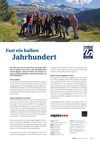 BEST OF Aus der Nachbarschaft BEST OF Portrait xxx 1452Wir sehen was, das Du nicht siehst. Und sorgen daf%u00fcr, dass Du gesehen wirst. Bei uns wirkt Werbung anders: Frontal. Regional. Genial. Mit Inhalt, der am%u00fcsiert, inspiriert und Dein Zielpublikum messerscharf avisiert. Na, schon interessiert?Wir sind MiplanDie Symbiose aus Medienverlag und Miplanpower gepaart mit dem Know-how unserer kreativen K%u00f6pfe macht unsere Einzigartigkeit aus. Als unabh%u00e4ngiges Schweizer Medienunternehmen produzieren wir seit 45%u00a0Jahren qualitativ hochstehende Produkte in den Bereichen Online, Print medien und kartografi sche F%u00fchrsysteme. Wir bringen Deine Kommunikation ins Rollen.Hautnah bei Deinen Kund:innenMit Deiner Werbung in unseren %u00fcber 20%u00a0Produkten erreichst Du tausende Einwoh ner:innen im deutschsprachigen Raum. Von wegen %u00abPrint ist out%u00bb: Das BEST OF, unser Flaggschiff, beweist genau das Gegenteil. Von A wie Architektin bis Z wie Zahnarzt: Bei uns ist die ganze Bandbreite an Unternehmen und Branchen vertreten. Und so funktionierts: Journalistisch recher chiert und eingebunden ins Hochglanz-Paket wird Dein Firmenportr%u00e4t im ganzen Kanton unter die Leute gebracht. Genau dorthin, wo es gesehen werden soll. Unser zweites Produkt ist das Hochglanzmagazin Meine Region. Ein bunter Mix aus Beitr%u00e4gen zu aktuellen Themen sowie Trends und Portr%u00e4ts, die das pulsierende Gewerbe und das bunte Vereinsleben in der Region widerspiegeln, bringt Vertrauen und Zusammenhalt in die jeweilige Region.Der Ursprung: unsere Orts- und Stadtpl%u00e4ne in Form von laminierten Aushangpl%u00e4nen. Im Jahr 2023 haben wir unsere Produkte einem Relaunch mit neuem Inhaltskonzept und diverseren Sales-M%u00f6glichkeiten unterzogen. In diesem Zuge entstand auch die Marke %u00abmeine-region.ch%u00bb.Werde Teil eines engagierten TeamsDie Heimat der Miplan liegt in H%u00e4gendorf im Kanton Solothurn. Wir besch%u00e4ftigen %u00fcber 40 Mitarbeitende in der gesamten Deutschschweiz in %u00fcber zehn unterschiedlichen Berufen. Ein:e Miplaner:in zu sein, bedeutet Teil eines engagierten, motivierten Teams zu sein. Gemeinsam feiern wir Erfolge und haben jede Menge Spass. Bei uns arbeiten sowohl j%u00fcngere als auch %u00e4ltere Generationen t%u00e4glich eng zusammen. Jeder kann von jedem lernen und gemeinsam bilden wir ein tolles Team. Wir wurden als Arbeitgeberin mit dem kununu %u00abTOP Company Award 2025%u00bb ausgezeichnet. Darauf sind wir besonders stolz.Die Medienlandschaft ver%u00e4ndert sich rasend schnell. Um Schritt zu halten, braucht es einen starken Motor: engagierte Mitarbeitende! Du willst Teil des Teams werden? Informiere dich jetzt auf miplan.ch/jobs %u00fcber unsere offenen Stellen.Fast ein halbes JahrhundertAdresse: Miplan AGFabrikstrasse 10, 4614 H%u00e4gendorf SOTelefon: +41 62 210 10 10E-Mail: info@miplan.chWeb: www.miplan.ch, www.best-of-magazin.ch, www.golocal.swissFacebook: miplan.ag.chLinkedIn: company/miplan-agIn K%u00fcrze: Wir bringen Deine Kommunikation ins Rollen! Die Miplan AG sorgt seit 45 Jahren daf%u00fcr, dass Du an strategisch ausgesuchten Stellen pr%u00e4sent bist. Local Power mit Zeitschriften, Kartografi e und Onlinemedien. Unser Erfolgskonzept heisst Zuverl%u00e4ssigkeit.CMYCMMYCYCMYKkununu_TopCompanyBadge_2025_CMYK Kopie.pdf 1 10.06.24 11:16
