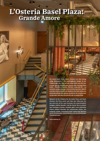 152 BEST OF xxxL%u2019Osteria Basel Plaza: Grande AmoreDie beste beste Pizza, Pasta d%u2019amore und eine einzigartige Atmosph%u00e4re %u2013 ein unschlagbares Rezept. In der L%u2019Osteria geht die T%u00fcre auf und schon f%u00fchlt man sich wie in einer typisch italienischen Osteria: Hier kommen Menschen %u2013 Familien, Freunde, P%u00e4rchen, Jung und Alt %u2013 zusammen, um gut zu essen. Es ist ein bisschen laut, lebhaft und %u00fcber allem schwebt der k%u00f6stliche Duft der echten italienischen K%u00fcche. Ein offener, herzlicher Ort, an dem man so sein darf, wie man ist und sich wie zu Hause f%u00fchlt.Bekannt ist die L%u2019Osteria f%u00fcr die beste Pizza und Pasta d%u2019amore. Die Pizza reicht weit %u00fcber den Tellerrand hinaus und wird oft f%u00fcr zwei Personen mit unterschiedlich belegten H%u00e4lften bestellt. Und die Pasta? Die ist einfach zum Verlieben al dente. Daneben gibt%u2019s noch zahlreiche andere zeitlose Klassiker der italienischen K%u00fcche, wie Antipasti, Salate, himmlische Dolci sowie eine Wochenkarte mit saisonalen K%u00f6stlichkeiten und verschiedensten Pastakreationen.www.losteria.ch