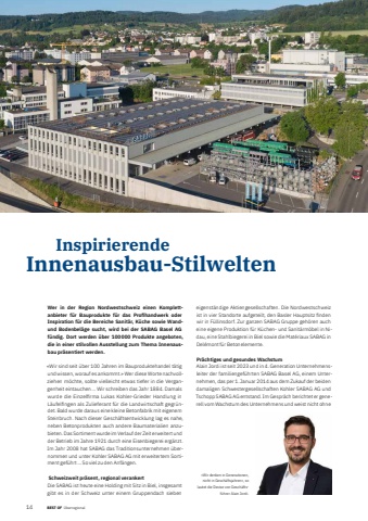 14 BEST OF BEST OF %u00dcberregional Portrait xxx Inspirierende Innenausbau-StilweltenWer in der Region Nordwestschweiz einen Komplettanbieter f%u00fcr Bauprodukte f%u00fcr das Profi handwerk oder Inspiration f%u00fcr die Bereiche Sanit%u00e4r, K%u00fcche sowie Wandund Bodenbel%u00e4ge sucht, wird bei der SABAG Basel%u00a0 AG f%u00fcndig. Dort werden %u00fcber 100 000 Produkte angeboten, die in einer stilvollen Ausstellung zum Thema Innenausbau pr%u00e4sentiert werden.%u00abWir sind seit %u00fcber 100 Jahren im Bauproduktehandel t%u00e4tig und wissen, worauf es ankommt.%u00bb Wer diese Worte nachvollziehen m%u00f6chte, sollte vielleicht etwas tiefer in die Vergangenheit eintauchen ... Wir schreiben das Jahr 1884. Damals wurde die Einzelfi rma Lukas Kohler-Grieder Handlung in L%u00e4ufelfi ngen als Zulieferant f%u00fcr die Landwirtschaft gegr%u00fcndet. Bald wurde daraus eine kleine Betonfabrik mit eigenem Steinbruch. Nach dieser Gesch%u00e4ftsentwicklung lag es nahe, neben Betonprodukten auch andere Baumaterialien anzubieten. Das Sortiment wurde im Verlauf der Zeit erweitert und der Betrieb im Jahre 1921 durch eine Eisenbiegerei erg%u00e4nzt. Im Jahr 2008 hat SABAG das Traditionsunternehmen %u00fcbernommen und unter Kohler SABAG AG mit erweitertem Sortiment gef%u00fchrt %u2026 So viel zu den Anf%u00e4ngen. Schweizweit pr%u00e4sent, regional verankertDie SABAG ist heute eine Holding mit Sitz in Biel, insgesamt gibt es in der Schweiz unter einem Gruppendach sieben %u00abWir denken in Generationen, nicht in Gesch%u00e4ftsjahren%u00bb, so lautet die Devise von Gesch%u00e4ftsf%u00fchrer Alain Jordi.eigenst%u00e4ndige Aktiengesellschaften. Die Nordwestschweiz ist in vier Standorte aufgeteilt, den Basler Hauptsitz fi nden wir in F%u00fcllinsdorf. Zur ganzen SABAG Gruppe geh%u00f6ren auch eine eigene Produktion f%u00fcr K%u00fcchen- und Sanit%u00e4rm%u00f6bel in Nidau, eine Stahlbiegerei in Biel sowie die Mat%u00e9riaux SABAG in Del%u00e9mont f%u00fcr Betonelemente.Pr%u00e4chtiges und gesundes WachstumAlain Jordi ist seit 2023 und in 4. Generation Unternehmensleiter der familiengef%u00fchrten SABAG Basel AG, einem Unternehmen, das per 1. Januar 2014 aus dem Zukauf der beiden damaligen Schwestergesellschaften Kohler SABAG AG und Tschopp SABAG AG entstand. Im Gespr%u00e4ch berichtet er generell vom Wachstum des Unternehmens und weist nicht ohne