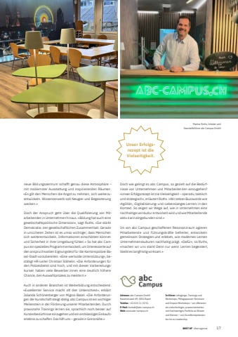 BEST OF %u00dcberregional 17BEST OF Portrait xxx 2Adresse: abc Campus GmbHNauenstrasse 49, 4052 BaselTelefon: +41 615 11 32 51E-Mail: kontakt@abc-campus.chWeb: www.abc-campus.chIn K%u00fcrze: Lehrg%u00e4nge, Trainings und Workshops, Mittagspausen-Seminare und Impuls-Workshops %u2013 wir offerieren ein vielschichtiges, praxisorientiertes und hochwertiges Portfolio an Wissen und K%u00f6nnen %u2013 von Grundkompetenzen bis hin zu Leadership.Markus Ruths, Inhaber und Gesch%u00e4ftsf%u00fchrer abc Campus GmbH neue Bildungszentrum schafft genau diese Atmosph%u00e4re %u2013 mit modernster Ausstattung und inspirierenden R%u00e4umen. %u00abEs gilt den Menschen die Angst zu nehmen, sich weiterzuentwickeln. Wissenserwerb soll Neugier und Begeisterung wecken.%u00bbDoch der Anspruch geht %u00fcber die Qualifi zierung von Mitarbeitenden in Unternehmen hinaus. %u00abBildung hat auch eine gesellschaftspolitische Dimension%u00bb, sagt Ruths. %u00abSie st%u00e4rkt Demo kratie, den gesellschaftlichen Zusammenhalt. Gerade in unsicheren Zeiten ist es umso wichtiger, dass Menschen sich weiterentwickeln, Informationen einsch%u00e4tzen k%u00f6nnen und Sicher heit in ihrer Umgebung f%u00fchlen.%u00bb So hat abc Campus ein spezielles Programm entwickelt, um Interessierte auf den anspruchsvollen Eignungstest f%u00fcr die Kantonspolizei Basel-Stadt vorzubereiten. %u00abEine wertvolle Unterst%u00fctzung%u00bb, best%u00e4tigt HR-Leiter Christian St%u00e4helin. %u00abDie Anforderungen f%u00fcr den Polizeidienst sind hoch, und mit diesen Vorbereitungskursen haben viele Bewerber:innen eine deutlich h%u00f6here Chance, den Auswahlprozess zu meistern.%u00bbAuch in anderen Branchen ist Weiterbildung entscheidend. %u00abExzellenter Service macht oft den Unterschied%u00bb, erkl%u00e4rt Jolanda Sch%u00f6nenberger von Migros Basel. %u00abDie Anforderungen der Kundschaft steigt stetig. abc Campus ist ein wichtiger Meilenstein in der F%u00f6rderung unserer Mitarbeitenden. Durch praxisnahe Trainings lernen sie, sprachlich noch besser auf Kundenbe d%u00fcrfnisse einzugehen und ein erstklassiges Einkaufserlebnis zu schaffen. Das hilft uns %u2013 gerade in Grenzn%u00e4he.%u00bbDoch wie gelingt es abc Campus, so gezielt auf die Bed%u00fcrfnisse von Unternehmen und Mitarbeitenden einzugehen? %u00abUnser Erfolgsrezept ist die Vielseitigkeit %u2013 operativ, taktisch und strategisch%u00bb, erl%u00e4utert Ruths. %u00abWir setzen Buzzwords wie %u2039Agilit%u00e4t%u203a, %u2039Digitalisierung%u203a und %u2039Lebenslanges Lernen%u203a in den Kontext. So zeigen wir Wege auf, wie in Unternehmen eine nachhaltige Lernkultur entwickelt wird und wie Mitarbeitende aktiv darin eingebunden sind.%u00bbIm von abc Campus geschaffenen Resonanzraum agieren Mitarbeitende und F%u00fchrungskr%u00e4fte befreiter, entwickeln gemeinsam Strategien und erleben, wie modernes Lernen Unternehmenskulturen nachhaltig pr%u00e4gt. %u00abDaf%u00fcr%u00bb, so Ruths, %u00abmachen wir uns stark! Denn nur wenn Lernen begeistert, bleibt es langfristig wirksam.%u00bbUnser Erfolgsrezept ist die Vielseitigkeit.
