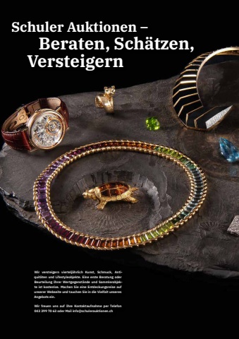 Wir versteigern viertelj%u00e4hrlich Kunst, Schmuck, Antiquit%u00e4ten und Lifestyleobjekte. Eine erste Beratung oder Beurteilung Ihrer Wertgegenst%u00e4nde und Sammlerobjekte ist kostenlos. Machen Sie eine Entdeckungsreise auf unserer Webseite und tauchen Sie in die Vielfalt unseres Angebots ein. Wir freuen uns auf Ihre Kontaktaufnahme per Telefon 043 399 70 63 oder Mail info@schulerauktionen.chSchuler Auktionen %u2013 Beraten, Sch%u00e4tzen, Versteigern