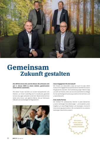 20 BEST OF %u00dcberregional 1 BEST OF Portrait xxxGemeinsam Zukunft gestaltenDie ARTUS Unicon AG und die Allcons AG schlossen sich per 1. Januar 2025 zu einem starken, gemeinsamen Unter nehmen zusammen. Mit dieser Fusion b%u00fcndeln wir unsere Kompetenzen und St%u00e4rken, um Ihnen zuk%u00fcnftig noch innovativere, ganzheitlichere L%u00f6sungen anbieten zu k%u00f6nnen. Beide Unternehmen teilen eine Vision und gleiche Werte, die auf Vertrauen, Tatkraft und nachhaltigem Erfolg basieren.Unser Engagement f%u00fcr die ZukunftWir freuen uns besonders, dass wir auch im Jahr 2025 erneut eine engagierte Auszubildende f%u00fcr die ARTUS Unicon AG gewinnen konnten. Die Ausbildung junger Talente liegt uns sehr am Herzen, denn sie ist eine essenzielle Grundlage f%u00fcr die nachhaltige Entwicklung unseres Unternehmens und unserer Branche.Zwei starke PartnerWir bleiben Ihr verl%u00e4sslicher Partner in allen Bereichen unserer bisherigen Dienstleistungen %u2013 und erweitern unser Angebot um neue M%u00f6glichkeiten und Synergien, die durch diese Vereinigung entstehen. Wir sind weiterhin an unseren bisherigen Standorten pr%u00e4sent.Ihre Vision %u2013unsere Tatkraft.GEMEINSAMEINFACH MACHEN.