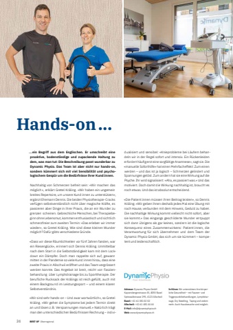 241 BEST OF BEST OF %u00dcberregional Portrait xxxHands-on ...Adresse: Dynamic Physio GmbH Kaysersbergerstrasse 45, 4055 Basel Spitzwaldstrasse 195, 4123 Allschwil Basel: +41 61 381 02 02Allschwil: +41 61 481 44 44 E-Mail: info@dynamicphysio.chWeb: www.dynamicphysio.chIn K%u00fcrze: Wir unterst%u00fctzen ihre k%u00f6rperliche Gesundheit %u2013 mit Faszien- und Trigger punktbehandlungen, Lymphdrainage, Dry Needling, Taping und vielem mehr. Auch Hausbesuche sind m%u00f6glich.... ein Begriff aus dem Englischen. Er umschreibt eine proaktive, bodenst%u00e4ndige und zupackende Haltung zu dem, was man tut: Die Beschreibung passt wunderbar zu Dynamic Physio. Das Team ist aber nicht nur hands-on, sondern k%u00fcmmert sich mit viel Sensibilit%u00e4t und psychologischem Gesp%u00fcr um die Bed%u00fcrfnisse ihrer Kund:innen.Nachhaltig von Schmerzen befreit sein: %u00abWir machen das m%u00f6glich%u00bb, erkl%u00e4rt Gretel Kr%u00e4ling. %u00abWir haben ein ungemein breites Repertoire, um unsere Kund:innen zu unterst%u00fctzen%u00bb, erg%u00e4nzt Ehemann Dennis. Die beiden Physiotherapie-Cracks verf%u00fcgen selbstverst%u00e4ndlich nicht %u00fcber magische Kr%u00e4fte, es passieren aber Dinge in ihrer Praxis, die an ein Wunder zu grenzen scheinen. Gebrechliche Menschen, bei Therapiebeginn ohne Lebensmut, kommen enthusiastisch und sichtlich schmerzfreier zum zweiten Termin: %u00abDas erleben wir immer wieder%u00bb, so Gretel Kr%u00e4ling. Wie sind diese kleinen Wunder m%u00f6glich? Daf%u00fcr gibts verschiedene Gr%u00fcnde.%u00abDass wir diese R%u00e4umlichkeiten vor f%u00fcnf Jahren fanden, war ein Riesengl%u00fcck%u00bb, erinnert sich Dennis Kr%u00e4ling. Unmittelbar nach dem Start in die Selbstst%u00e4ndigkeit kam mit dem Lockdown ein D%u00e4mpfer. Doch man rappelte sich auf, gewann mitten in der Pandemie so viele Kund:innen hinzu, dass eine zweite Praxis in Allschwil er%u00f6ffnet und das Team vergr%u00f6ssert werden konnte. Das Angebot ist breit, reicht von Faszienbehandlung %u00fcber Lymphdrainage bis zu Sporttherapie. Der berufliche Rucksack der Kr%u00e4lings ist reich gef%u00fcllt, auch mit einem Background im Leistungssport %u2013 und einem klaren Selbstverst%u00e4ndnis.%u00abWir sind sehr hands-on %u2013 Und zwar wortw%u00f6rtlich%u00bb, so Gretel Kr%u00e4ling. %u00abWir gehen die Symptome bei jedem Termin direkt an und l%u00f6sen z. B. Verspannungen manuell.%u00bb Nat%u00fcrlich tr%u00e4gt man den unterschiedlichen Bed%u00fcrfnissen Rechnung %u2013 individualisiert und sensibel: %u00abKnieprobleme bei L%u00e4ufern behandeln wir in der Regel sofort und intensiv. Ein R%u00fcckenleiden erfordert h%u00e4ufi g erst eine sorgf%u00e4ltige Anamnese%u00bb, sagt sie. Die %u00abmanuelle Soforthilfe%u00bb hat einen Mehrfacheffekt: Zum einen werden %u2013 und das ist ja logisch %u2013 Schmerzen gelindert und Spannungen gel%u00f6st. Zum andern hat sie eine Wirkung auf die Psyche. Ihr wird signalisiert: %u00abAha, es passiert was.%u00bb Und das motiviert. Doch damit die Wirkung nachhaltig ist, braucht es noch etwas. Und das ist absolut entscheidend.%u00abDie Patient:innen m%u00fcssen ihren Beitrag leisten%u00bb, so Dennis Kr%u00e4ling. %u00abWir geben ihnen deshalb jedes Mal eine %u00dcbung mit nach Hause, verbunden mit dem Hinweis, Geduld zu haben. Die nachhaltige Wirkung kommt vielleicht nicht sofort, aber sie kommt.%u00bb Das eingangs geschilderte Wunder entpuppt sich dann %u00fcbrigens als gar keines, sondern ist die logische Konsequenz eines Zusammenwirkens: Patient:innen, die Verantwortung f%u00fcr sich %u00fcbernehmen und dem Team der Dynamic Physio GmbH, das sich um sie k%u00fcmmert %u2013 kompetent und leidenschaftlich.