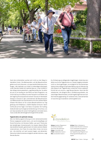 BEST OF Basel %u2013 Riehen %u2013 Bettingen BEST OF Portrait xxx 352Doch die Lichtstrahlen suchen sich nicht nur den Weg ins dandelion hinein. Die Betreuenden und die Bewohnenden gehen auch nach draussen, um spannende Erlebnisse einzufangen. %u00abWir befi nden uns mitten im lebendigen Kleinbasel, unser Standort bietet sich optimal dazu an, unser Umfeld in den Alltag miteinzubeziehen%u00bb, sagt Renato Bucher. So stehe ab und zu ein Ausflug an den Rhein auf dem Programm, nat%u00fcrlich darf auch ein Besuch an der Fasnacht nicht fehlen und der Vogel Gryff wird jeweils bei seinem Tanz durch Kleinbasel bestaunt. Einmal im Jahr unternehmen die Bewohnenden und Betreuenden des Demenzzentrums eine weitere Reise. %u00abDiesen Mai fahren wir f%u00fcr unsere Bewohnerferien ins Toggenburg nach Wildhaus%u00bb, erz%u00e4hlt Stephan Scheurer. Seine Vorfreude auf die Tage in der Natur ist sp%u00fcrbar. Der Ausflug bedeutet aber auch einiges an Vorbereitung. Im Kurhaus, wo sich das dandelion f%u00fcr seine Fr%u00fchlingsferien einmieten kann, muss vorab alles demenzgerecht eingerichtet werden. Tagesstruktur als optimale L%u00f6sungWie die Wohnungseinrichtung an eine demenzerkrankte Person angepasst werden kann, und wie Aromapflege und Musik Menschen mit Demenz helfen, war auch Thema bei der letztj%u00e4hrigen Industrienacht. An diesem Abend %u00f6ffnet das dandelion jeweils, gemeinsam mit vielen anderen Basler Unternehmen, ihre T%u00fcren f%u00fcr einen Blick hinter die Kulissen. %u00abSo m%u00f6chten wir nach aussen tragen, wie dementen Menschen helle Momente erm%u00f6glicht werden k%u00f6nnen%u00bb, sagt Renato Bucher. Zur Entlastung von pflegenden Angeh%u00f6rigen, bietet das dandelion auch eine Tagesstruktur an. Dieses Angebot entlastet nicht nur die Angeh%u00f6rigen, es erm%u00f6glicht f%u00fcr die Demenzpatienten einen Alltag mit optimaler Betreuung und Aktivierung. %u00abDer Besuch der Tagesstruktur erleichtert einen sp%u00e4teren Eintritt bei uns enorm%u00bb, sagt Renato Bucher. Denn die Mitarbeitenden, die %u00fcbrigens alle in Zivilkleidung arbeiten, die zuk%u00fcnftigen Bewohnenden und die Angeh%u00f6rigen kennen sich dann bereits gegenseitig. Ein weiteres Indiz, dass die famili%u00e4re Ausrichtung im dandelion wirklich gelebt wird.Adresse: dandelion Pflegezentrum f%u00fcr Menschen mit DemenzSperrstrasse 100, 4057 BaselTelefon: +41 61 699 15 00E-Mail: info@dandelion-basel.chWeb: www.dandelion-basel.chIn K%u00fcrze: Mitten in Kleinbasel im dandelion fi nden Menschen mit Demenz in einer wohltuenden Atmosph%u00e4re ein sicheres und geborgenes Zuhause. Auch Tagesbetreuung, Mittagstisch und Entlastungsaufenthalte geh%u00f6ren zum Angebot.