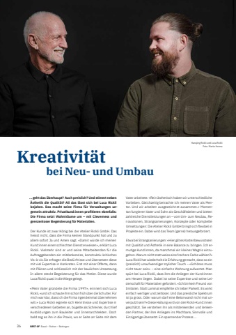 361 BEST OF BEST OF Basel %u2013 Riehen %u2013 Bettingen Portrait xxxKreativit%u00e4t bei Neu- und Umbau... geht das %u00fcberhaupt? Auch preislich? Und stimmt neben %u00c4sthetik die Qualit%u00e4t? All das l%u00e4sst sich bei Luca Rickli bejahen. Das macht seine Firma f%u00fcr Verwaltungen ungemein attraktiv. Privatkund:innen profi tieren ebenfalls: Die Firma setzt Wohntr%u00e4ume um %u2013 mit Cleverness und grenzenloser Begeisterung f%u00fcr Materialien.Der Kunde ist zwar K%u00f6nig bei der Atelier Rickli GmbH. Das heisst nicht, dass die Firma keinen Standpunkt hat und zu allem sofort Ja und Amen sagt. %u00abDamit w%u00fcrde ich meinen Kund:innen einen schlechten Dienst erweisen%u00bb, erkl%u00e4rt Luca Rickli. Vielmehr sind er und seine Mitarbeitenden f%u00fcr die Auftraggebenden ein mitdenkendes, konstruktiv-kritisches Vis-%u00e0-vis.Sie erfragen die Bed%u00fcrfnisse und %u00fcbersetzen diese mit viel Expertise in Konkretes. Erst mit einer Offerte, dann mit Pl%u00e4nen und schliesslich mit der baulichen Umsetzung. In allem steckt Begeisterung f%u00fcr das Metier. Diese wurde Luca Rickli quasi in die Wiege gelegt. %u00abMein Vater gr%u00fcndete die Firma 1997%u00bb, erinnert sich Luca Rickli, %u00abund ich schaute ihm schon fr%u00fch %u00fcber die Schulter. F%u00fcr mich war klar, dass ich die Firma irgendeinmal %u00fcbernehmen will.%u00bb Luca Rickli eignete sich Kenntnisse und Expertise in verschiedenen Gebieten an, b%u00fcgelte als Schreiner, durchlief Ausbildungen zum Bauleiter und Innenarchitekten. Doch bald zog es ihn in die Praxis, wo er Seite an Seite mit dem Hansj%u00f6rg Rickli und Luca Rickli Foto: Martin HeimaVater arbeitete. %u00abRein %u00e4sthetisch haben wir unterschiedliche Vorlieben. Gleichzeitig betrachte ich meinen Vater als Mentor. Und wir arbeiten ausgezeichnet zusammen.%u00bb Momentan fungieren Vater und Sohn als Gesch%u00e4ftsleiter und bieten zahlreiche Dienstleistungen an %u2013 vom Um- zum Neubau, Renovationen, Strangsanierungen, Konzepte oder komplette Umsetzungen: Die Atelier Rickli GmbH bringt sich flexibel in Projekte ein. Dabei wird das Team (gerne) herausgefordert. Etwa bei Strangsanierungen: %u00abHier gilt es Kostenbewusstsein mit Qualit%u00e4t und %u00c4sthetik in eine Balance zu bringen. Ich ermutige Kund:innen, da manchmal ein kleines Wagnis einzugehen. Warum nicht statt weiss eine frechere Farbe w%u00e4hlen?%u00bb Luca Rickli hat wiederholt die Erfahrung gemacht, dass so ein (preislich) unaufwendiger stylisher Touch %u2013 %u00abSch%u00f6nes muss nicht teuer sein%u00bb %u2013 eine einfache Wohnung aufwertet. Man sp%u00fcrt bei Luca Rickli, dass ihm die Anliegen der Kund:innen am Herzen liegen. Dabei ist seine Expertise und seine Leidenschaft f%u00fcr Materialien gefordert. %u00abIch bin kein Freund von Imitaten. Statt Laminat empfehle ich lieber Parkett. Es wirkt einfach wertiger und zeitloser. Und das preisliche Spektrum ist ja gross. Oder warum darf eine Betonwand nicht mal unverputzt sein?%u00bb Diese Haltung wird von den Rickli-Kund:innen gesch%u00e4tzt. Sie verstehen ihn als mitdenkenden und lenkenden Partner, der ihre Anliegen ins Machbare, Sinnvolle und Einzigartige %u00fcbersetzt. Ein spannender Prozess ...