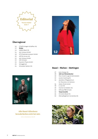 2 BEST OF Inhaltsverzeichnis12%u00dcberregional10 ETAVIS Kriegel+Schaffner AG12 Nubya14 SABAG Basel AG16 abc Campus GmbH18 MTS Patiententransport GmbH20 ARTUS Unicon AG22 abc Campus GmbH23 HEV Schweiz24 Dynamic Physio GmbH 25 Schoggih%u00fcsli26 Schweizer Salinen AGBasel %u2013 Riehen %u2013 Bettingen27 Kuhn Design AG28 Jo%u00ebl von Mutzenbecher30 Merz Oralchirurgie & Zahnmedizin32 avvera Coaching AG34 dandelion Pflegezentrum f%u00fcr Menschen mit Demenz36 Atelier Rickli GmbH38 b. care AG40 Vischer Architekten AG42 Stiftung TBB Schweiz44 Tanja Grandits46 Immoline Basel AG50 Alterspflegeheim Humanitas AGEditorialThomas K%u00fcblerSeite 7Alle Basel-Klischees bewahrheiten sich bei mir.Jo%u00ebl von Mutzenbecher, Seite 284428