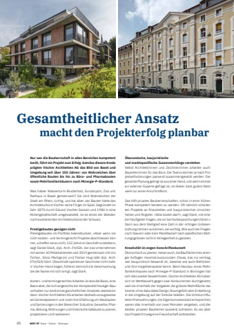 401 BEST OF BEST OF Basel %u2013 Riehen %u2013 Bettingen Portrait xxxGesamtheitlicher Ansatz macht den Projekterfolg planbarNur wer die Bauherrschaft in allen Bereichen kompetent ber%u00e4t, f%u00fchrt ein Projekt zum Erfolg. Gem%u00e4ss diesem Kredo pr%u00e4gten Vischer Architekten AG das Bild von Basel und Umgebung seit %u00fcber 150 Jahren: von Wahrzeichen %u00fcber %u00f6ffentliche Bauten bis hin zu B%u00fcro- und Pharmabauten sowie Mehr familienh%u00e4usern nach Minergie-P- Standard. Was haben Wasserturm Bruderholz, Euroairport, Zoo und Rathaus in Basel gemeinsam? Sie sind Wahrzeichen der Stadt am Rhein, richtig, und bei allen vier Bauten hatte das Architekturb%u00fcro Vischer seine Finger im Spiel. Gegr%u00fcndet im Jahr 1870 durch Eduard Vischer-Sarasin und 1984 in eine Aktiengesellschaft umgewandelt, ist es eines der %u00e4ltesten noch existierenden Architekturb%u00fcros der Schweiz.Prestigebauten gen%u00fcgen nichtPrestigebauten im Portfolio beeindrucken. %u00abAber wenn sie nicht kosten- und termingerecht Projekte abschliessen k%u00f6nnen, schaffen sie es nicht, 153 Jahre im Gesch%u00e4ft zu bleiben%u00bb, sagt Daniel Stark, dipl. Arch. FH/SIA, der das Unternehmen mit seinen 40 Mitarbeitenden seit 2019 gemeinsam mit Urs Tschan, Silvio Martignoni und Florian Hug (alle dipl. Arch. ETH/SIA) f%u00fchrt. Obwohl die operativen Geschicke nicht mehr in Vischer-Hand liegen, f%u00fchle er dennoch die Verantwortung, die der Name mit sich bringt, sagt Stark.Kosten- und termingerechtes Arbeiten ist also die Basis, eine Basis aber, die sich angesichts der Komplexit%u00e4t heutiger Bauvorhaben nur dank eines ganzheitlichen Ansatzes realisieren l%u00e4sst. Vischer Architekten AG arbeiten deshalb vorzugsweise als Generalplanerin und nutzt ihre Erfahrung um Neubauten und Sanierungen in den Bereichen Industrie, Gewerbe, Pharma, Bildung, Wohnungen und historische Geb%u00e4ude zu planen, projektieren und realisieren. %u00d6konomische, baujuristische und marktspezifi sche Zusammenh%u00e4nge verstehenNebst Architekt/innen und Zeichner/innen ar beiten auch Bauleiter/innen f%u00fcr das B%u00fcro. Die Teams k%u00f6nnen je nach Projektanforderungen passend zusammengesetzt werden. Die gesamte Planung gelingt so aus einer Hand, und wenn einmal ein externer Experte gefragt ist, ist dieser dank gutem Netzwerk nur einen Anruf entfernt. Das hilft privaten Bauherrenschaften, schon in einer fr%u00fchen Phase kompetent beraten zu werden. Oft n%u00e4mlich scheiterten Projekte an fi nanziellen und baujuristischen Unsicherheiten und %u00c4ngsten. %u00abWas kostet das?%u00bb, sagt Stark, %u00abist eine der h%u00e4ufi gsten Fragen, die wir bei Vorbesprechungen h%u00f6ren.%u00bb Dann aus dem Stehgreif eine Zahl in der richtigen Gr%u00f6ssenordnung nennen zu k%u00f6nnen, sei wichtig. Wie auch bei Fragen nach Steuern oder dem Marktbedarf nach spezifi schen Wohnungsgr%u00f6ssen nicht in Verlegenheit zu geraten.Kreativit%u00e4t im engen Vorschriftenkorsett%u00d6konomisch zu planen, heisst auch, die Baufl%u00e4che trotz strenger Auflagen maximal auszunutzen. Etwas, das nur vermag, wer baujuristisch bewandt ist, Gesetze wie auch Beh%u00f6rden und ihre Vorgehensweise kennt. Beim Neubau eines Mehrfamilienhauses nach Minergie-P-Standard in Binningen hat sich dies wieder bewahrheitet. Vischer Architekten AG haben sich im Wettbewerb gegen zwei Konkurrenten durchgesetzt, weil sie innerhalb der Vorgaben die gr%u00f6sste Wohnfl%u00e4che realisierte, ohne dass dabei Design, Raumgef%u00fchl oder Einbettung in die Umgebung auf der Strecke blieben. Die lichtdurchfluteten Mietwohnungen, die Eigentumsstandard entsprechen, waren alle innerhalb von zwei Monaten vergeben, und die beiden privaten Bauherren %u00e4usserst zufrieden. Es sei %u00fcber das Projekt hinweg eine Freundschaft entstanden.