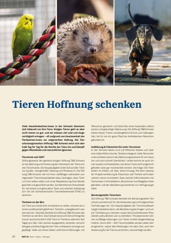 421 BEST OF Portrait xxxTieren Hoffnung schenken Viele Haustierbesitzer:innen in der Schweiz k%u00fcmmern sich liebevoll um ihre Tiere. Einigen Tieren geht es aber nicht immer so gut, und sie m%u00fcssen viel Leid und Ungerechtigkeit ertragen %u2013 oft aufgrund von Unwissenheit der Tierbesitzer:innen zur artgerechten Haltung. Die Tierschutzorganisation Stiftung TBB Schweiz setzt sich deshalb Tag f%u00fcr Tag f%u00fcr die Rechte der Tiere ein und k%u00e4mpft gegen Missst%u00e4nde und menschliche Ignoranz. Tierschutz seit 1897Stiftungszweck der gemeinn%u00fctzigen Stiftung TBB Schweiz ist die Wahrung und F%u00f6rderung der Interessen der Tiere und des Tierschutzes. Die Hauptaufgabe ist der Schutz aller Tiere vor Qualen, mangelhafter Haltung und Missbrauch. Die Stiftung TBB Schweiz will mit ihren vielf%u00e4ltigen nationalen und regionalen Tierschutzprojekten dazu beitragen, dass Tiere um ihrer selbst willen und unter Respektierung ihrer W%u00fcrde geachtet und gesch%u00e4tzt werden. Sie betreibt eine Anlaufstelle f%u00fcr vermisste und gefundene Tiere und arbeitet diesbez%u00fcglich mit der Schweizerischen Tiermeldezentrale STMZ zusammen.Tierheim an der Birs Um Tiere aus misslichen Umst%u00e4nden zu retten, m%u00fcssen sie in einem professionell gef%u00fchrten Tierheim untergebracht werden k%u00f6nnen. Deshalb betreibt die Stiftung TBB Schweiz das Tierheim an der Birs. Das Fachpersonal und die Lehrlinge betreuen durchschnittlich 250 Tiere im Tierheim w%u00e4hrend 365 Tagen pro Jahr. Hier werden ausgesetzte, verletzte, vernachl%u00e4ssigte und beschlagnahmte Tiere umfassend versorgt und gepflegt. Viele von ihnen haben schlimme Erfahrungen mit Menschen gemacht und bed%u00fcrfen einer besonders behutsamen und geduldigen Betreuung. Die Stiftung TBB Schweiz bietet diesen Tieren vor%u00fcbergehend Schutz und Geborgenheit, bis f%u00fcr sie ein guter Platz bei tierliebenden Menschen gefunden ist.Aufkl%u00e4rung & Pr%u00e4vention f%u00fcr mehr TierschutzIn der Schweiz leben rund 1,8 Millionen Katzen und %u00fcber eine halbe Million Hunde, Tendenz steigend. Viele Menschen untersch%u00e4tzen jedoch den Betreuungsaufwand f%u00fcr ein Haustier und sind schnell %u00fcberfordert. Leider kommt es auch immer wieder zu Missst%u00e4nden, bei denen Tiere nicht artgerecht gehalten oder gar misshandelt werden. Die Folge: Die Tiere leiden im Stillen, oft %u00fcber Jahre hinweg. Mit dem nationalen Projekt Aufkl%u00e4rung & Pr%u00e4vention soll Tierleid verhindert werden, bevor es entsteht. Dazu werden Informationen und Fach wissen in Merkbl%u00e4ttern, Brosch%u00fcren und Ratgebern festgehalten und der Bev%u00f6lkerung kostenlos zur Verf%u00fcgung gestellt.Beratungsstelle Tierschutz Die Stiftung TBB Schweiz betreibt die Beratungsstelle Tierschutz und setzt sich f%u00fcr die Verbesserung nicht artgerechter Tierhaltungen ein. Die Hauptaufgaben der Tierschutzbeauftragten bestehen darin, die Bev%u00f6lkerung bei Fragen rund um die Tierhaltung zu beraten sowie tierschutzrelevante Missst%u00e4nde aufzudecken und zu beheben. Privatpersonen k%u00f6nnen auff%u00e4llige Haltungen von Tieren mittels Klagemeldung melden. Rund 200 %u2013 300 Tierschutzf%u00e4lle werden jedes Jahr eingereicht, wobei alle Meldungen mit dem Ziel, eine Verbesserung f%u00fcr die Tiere zu erreichen, nachverfolgt werden.BEST OF Basel %u2013 Riehen %u2013 Bettingen