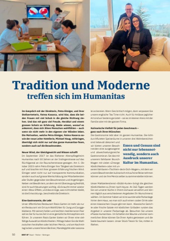 501 BEST OF BEST OF Basel %u2013 Riehen %u2013 Bettingen Portrait xxxTradition und Moderne treffen sich im HumanitasIm Gespr%u00e4ch mit der Direktorin, Petra Elmiger, und ihrer Stellvertreterin, Fatma Kasarca, wird klar, dass die beiden Frauen mit viel Schub in die gleiche Richtung ziehen. Und das mit ganz viel Freude, Herzblut und einem grossen Schatz an Erfahrung. Beide wissen, worauf es ankommt, dass sich %u00e4ltere Menschen wohlf%u00fchlen %u2013 auch wenn sie nicht mehr in den eigenen vier W%u00e4nden leben. Die Motivation, welche Petra Elmiger, Fatma Kasarca sowie der neue Leiter Hotellerie, Michael Haug, mitbringen, %u00fcbertr%u00e4gt sich nicht nur auf das ganze Humanitas-Team, sondern auch auf die Bewohnenden.Neuer Wind, der Gleichgewicht und Wissen schafftIm September 2017 ist das Riehener Alterspflegeheim Humanitas nach 50 Jahren an der Inzlingerstrasse auf das R%u00fcchligareal an die Rauracherstrasse gezogen. Am 1. Oktober 2023 nahm Petra Elmiger ihre T%u00e4tigkeit als Direktorin auf und brachte mit ihrer grossen Erfahrung frischen Wind. Elmiger setzt nicht nur auf transparente Kommunikation, sondern auch auf grosse Wertsch%u00e4tzung der Mitarbeitenden aller Stufen gegen%u00fcber den Bewohnenden und Angeh%u00f6rigen. Neben viel Bew%u00e4hrtem, an dem sie mit %u00dcberzeugung festh%u00e4lt, sind ihr auch Neuerungen wichtig. %u00abEs braucht immer wieder einen %u2039Wow-Effekt%u203a, und das einzige, was nicht stehen bleibt, ist die Entwicklung%u00bb, beschreibt die Direktorin. Eine Gastronomie, die LebtUnser %u00f6ffentliches Restaurant Rosis Garten ist mehr als nur ein Restaurant: ein Ort zum Wohlf%u00fchlen f%u00fcr Jung und Junggebliebene. Mit seinem hellen und leichten mediterranen Flair soll es Sie f%u00fcr kurze Zeit in eine gem%u00fctliche Atmosph%u00e4re entf%u00fchren. In unserem Rosis Garten bieten wir Ihnen eine vielf%u00e4ltige Auswahl an K%u00f6stlichkeiten. Mittags haben Sie die Wahl zwischen herzhaften oder leichten Men%u00fcs, und am Nachmittag locken unsere feinen Berliner, Mandelgipfel oder saisonale Leckereien. Wenn Sies britisch m%u00f6gen, dann verpassen Sie unsere englische Tea Time nicht. Auch f%u00fcr Anl%u00e4sse jeglicher Art sind wir bestens ger%u00fcstet %u2013 sei es im kleinen Kreis mit der Familie oder mit der ganzen Firma.Kulinarische Vielfalt f%u00fcr jeden Geschmack %u2013 ganz nach Ihren W%u00fcnschenDie Gastronomie lebt aber im ganzen Humanitas. Die lichtdurchfluteten Speiser%u00e4ume in unseren drei Wohnbereichen sind liebevoll dekoriert und wir bieten unseren Bewohnenden eine ausgewogene und abwechselungsreiche Gastronomie an. Sei das mit unserem fahrbaren BrunchWagen mit vielen %u00abZmorge K%u00f6stlichkeiten%u00bb oder mit unserem fahrbaren %u00abTischlein-deck-Dich-Wagen%u00bb, mit dem wir unsere Bewohnenden kulinarisch mit auf eine Reise nehmen k%u00f6nnen und sie ihre Men%u00fcs selber zusammenstellen k%u00f6nnen.Unser Mahlzeitendienst %u00abSt%u00fcbli-Kurier%u00bb bringt die gleichen K%u00f6stlichkeiten zu Ihnen nach Hause. An 365 Tagen werden Sie von unserer K%u00fcche in Ihrem Zuhause verw%u00f6hnt und k%u00f6nnen t%u00e4glich aus verschiedenen Angeboten Ihr Wunschmen%u00fc w%u00e4hlen. Im Sommer haben wir eine wundervolle Parkan lage hinter dem Haus, wo man sich auch einen coolen Drink oder einen klassischen Coupe g%u00f6nnen kann. Klassische Gerichte oder frische Salate mit k%u00f6stlichen Grilladen runden das Angebot in unserer Parkanlage ab. Besuchen Sie unsere %u00abPiazza Humanitas%u00bb. Im Schatten der B%u00e4ume und einer sommerlichen Brise k%u00f6nnen Sie Ihren Ap%u00e9ro geniessen und die Seele baumeln lassen. Unser St%u00fcck Tessin f%u00fcr Sie, mitten in Riehen.Essen und Genuss sind nicht nur lebensnotwendig, sondern auch Ausdruck unserer Kultur im Humanitas.