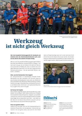 521 BEST OF BEST OF Basel %u2013 Riehen %u2013 Bettingen Portrait xxx Werkzeug ist nicht gleich Werkzeug Der gute Groove bei der G%u00f6tschi AG wird durch ein jungdynamisches Team tagt%u00e4glich sp%u00fcrbar. Wer eine komplette Werkzeugpalette f%u00fcr Handwerk und Industrie oder den Heimhandwerkerbereich sucht, wird bei der G%u00f6tschi AG im Basler Dreispitz f%u00fcndig.%u00abBei uns wird die pers%u00f6nliche Beratung gross geschrieben%u00bb, berichtet Gesch%u00e4ftsf%u00fchrer Gerhard G%u00f6tschi zu Beginn. Und man sp%u00fcrt das gut, bei der G%u00f6tschi AG steht der Mensch, die Kundschaft im Mittelpunkt. Das ist vielleicht die wichtigste Botschaft %u00fcberhaupt, will man das jungdynamische Familien unternehmen %u2013 mit der ber%u00fchmten W%u00fcrze in der K%u00fcrze %u2013 vorstellen.Alles, was des Handwerkers Herz begehrtAm Verkaufsstandort im Gewerbepark Dreispitz fi nden Berufsprofi s aus dem Handwerk, der Industrie sowie anspruchsvolle Heimhandwerker:innen mehr als 30 000 Artikel aus den Bereichen Werkzeug, Elektrowerkzeug, Zubeh%u00f6r, Hochdruckreiniger, Arbeitskleidung und Arbeitsschutz bis hin zu konfektionierten Hochdruck- und Hydraulikschl%u00e4uchen. Kurz, es gibt nichts, das es nicht gibt. Ihr Partner f%u00fcr ProjekteMarco G%u00f6tschi legt Wert darauf, die Kundschaft da zu unterst%u00fctzen, wo es n%u00f6tig ist. Nicht selten werden sie in Projekte als kompetente Gespr%u00e4chspartner integriert und erstellen mit den Kund:innen eine individuelle Bedarfsliste f%u00fcr Projekte. Viele Wege f%u00fchren bekanntlich nach Rom %u2013 oder eben ans Ziel. Wer sich die G%u00f6tschi AG als Partner aussucht, wird von dieser Reise einen deutlichen Mehrwert gewinnen. Muss man gesehen habenLetztlich sind das alles nicht von der Handwerkerhand zu weisende Pluspunkte, die den gewissen Unterschied ausmachen. Und wer genau weiss, was er/sie f%u00fcr eine Arbeit oder ein Projekt ben%u00f6tigt, kann sich immer noch den B to B Online- Service der G%u00f6tschi AG zunutze machen. Der direkte Gang zum Verkaufsstandort empfi ehlt sich aber trotzdem. Sie werden Augen machen, diese Auswahl ist schon eindr%u00fccklich.F%u00fcr Industrie und HandwerkAdresse: G%u00f6tschi AGDornacherstrasse 380, 4053 BaselTelefon: +41 61 337 45 11E-Mail: info@goetschi.chWeb: www.goetschi.chIn K%u00fcrze: Was einst als Gesch%u00e4ft f%u00fcr Handwerkzeuge f%u00fcr Gipser begann, ist mit den Jahrzehnten zum Anbieter mit einer attraktiven Werkzeugpalette sowie massgeschneiderter Beratung gewachsen.Vater und Sohn: Gerhard und Marco G%u00f6tschi stehen voll und ganz hinter ihrem Unternehmen.