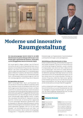 BEST OF Basel %u2013 Riehen %u2013 Bettingen BEST OF Portrait xxx 531Moderne und innovative RaumgestaltungGesch%u00e4ftsf%u00fchrer Philipp Henz ist Pr%u00e4sident des Malermeisterverbands Basel-Stadt. Die Unternehmensgruppe Heinrich Schmid ist mit 6000 Mitarbeitenden das gr%u00f6sste Malergesch%u00e4ft Europas. In der Schweiz gibt es gesamthaft f%u00fcnf Standorte. Heute geht%u2019s um die 1990 gegr%u00fcndete Heinrich Schmid%u00a0AG in Basel.Wir m%u00fcssen gleich zu Beginn aufl%u00f6sen, dass die Heinrich Schmid AG viel mehr ist als ein Malerbetrieb. Rasch wird im Gespr%u00e4ch mit Gesch%u00e4ftsleiter Philipp Henz klar, dass sich der Betrieb in den Jahren seines Bestehens stets weiterentwickelt hat. Nebst dem Malen fi nden wir im Dienstleistungsangebot die Bereiche Trockenbau oder Brandschutz, Bodenbeschichtungen, Stahl- und Betonschutz, Fassadensanierungen, Stuck- und Putzarbeiten, Schimmelsanierungen etc. %u00abWir sind sehr vielseitig aufgestellt%u00bb, erz%u00e4hlt Philipp Henz im Gespr%u00e4ch.Die Spezialit%u00e4ten des HausesNeben hochwertigen Maler-, Stuck- und Putzarbeiten hat sich die Heinrich Schmid AG im Bereich Trockenbau spezialisiert. Dabei beschr%u00e4nken sich die Basler Profi s nicht nur auf die Montage einzelner Elemente wie z. B. Decken- und Wandsysteme f%u00fcr eine optimale Raumakustik, sondern konzipieren und realisieren den Ausbau ganzer Nutzungsr%u00e4ume sowie die Sicherstellung des gesetzlich vorgegebenen Brandschutzes. Mit Bauelementen und Abschottungen k%u00f6nnen die beh%u00f6rdlichen Anforderungen z%u00fcgig umgesetzt werden. In jedem Fall ist das Basler Unternehmen Ihr Spezialist f%u00fcr den fachgerechten Unterhalt oder die Sanierung Ihrer Liegenschaft, um einen nachhaltigen Werterhalt zu gew%u00e4hrleisten. Auch als Spezialistin f%u00fcr besonders heikle Renovationen wird die Heinrich Schmid AG gerne bei komplexen Unterhalts- und Sanierungsarbeiten zugezogen, wenn es z. B. darum geht, Fassaden- und Schimmelsanierung bis zum Stahl- und Betonschutz anzubieten. R%u00e4ume werden mit einzigartigen Hintergr%u00fcnden in Fotoqualit%u00e4t professionell versch%u00f6nert. Dienstleistungen wie Tapezierarbeiten, Sandstrahlarbeiten und Pulverbeschichtungen runden das Angebot ab.Weiterbildung und Berufsnachwuchs im FokusStarke Kundenorientierung, professionelle Planungssicherheit, Qualit%u00e4t, Sauberkeit, Top-Service und Termintreue sind nicht einfach gut klingende Plattit%u00fcden, sondern verbriefte Firmengrunds%u00e4tze, nach denen das Team in Basel seit Jahren zuverl%u00e4ssig agiert. Dazu kommt ein stetes Wachstum und ein interessantes Hauptaugenmerk mit der sogenannten Weiterbildungstreppe. Diese zeigt imposant auf, wie das Unternehmen seine rund 40 Mitarbeitenden f%u00f6rdert und mit dem neusten Know-how und den aktuellsten Techniken unterst%u00fctzt. Philipp Henz, selber Dipl. Malermeister, legt Wert auf die Feststellung, dass sie auch f%u00fcr den Berufsnachwuchs ideale Ansprechpartner sind. Bei der Heinrich Schmid AG werden derzeit sechs Lernende als Maler EFZ ausgebildet.Last but not least darf darauf hingewiesen werden, dass die Heinrich Schmid AG auch von den Mitarbeitenden als sicherer Arbeitgeber mit guten Sozialleistungen sehr gesch%u00e4tzt wird. Die vielen langj%u00e4hrigen Mitarbeitenden bzw. die tiefe Fluktuation sprechen eine deutliche Sprache.Adresse: Heinrich Schmid AGBonergasse 10, 4057 BaselTelefon: +41 61 695 88 88E-Mail: basel@heinrich-schmid.chWeb: www.heinrich-schmid.chIn K%u00fcrze: Der Name Heinrich Schmid AG sorgt f%u00fcr Sicherheit. Einerseits f%u00fcr jene der Mitarbeitenden, die das nicht selten mit langj%u00e4hrigen Engagements in der Firma danken, und andererseits k%u00f6nnen sich die vielen regelm%u00e4ssigen Kund:innen einfach stets sicher sein, dass die Qualit%u00e4t stimmt.