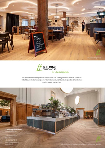 54 BEST OF xxxIhr Parkettl%u00e4deli bringt mit Massivdielen aus Eiche jeden Raum zum Strahlen. Edle Naturrohstoffe sorgen f%u00fcr Wohnlichkeit und Nachhaltigkeit in %u00f6ffentlichen und privaten Geb%u00e4uden.LT Building Solutions AGIhr %u00abParkettl%u00e4deli%u00bbG%u00fcterstrasse 2824053 Basel+41 61 511 92 30thierry.litzler@ltbs.chwww.ltbs.chDer Adler in Magden (AG)Die Lora Restaurant und Bar im Westfl%u00fcgel des SBB Bahnhofs Basel (BS)
