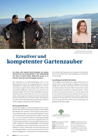 661 BEST OF BEST OF Basel %u2013 Riehen %u2013 Bettingen Portrait xxx Kreativer und kompetenter GartenzauberAdresse: Marcel Gartenservice GmbHBernerring 21, 4054 BaselTelefon: +41 76 321 11 30E-Mail: info@marcelgartenservice.chWeb: www.marcelgartenservice.chIn K%u00fcrze: Marcel Gartenservice steht seit der Firmengr%u00fcndung unter einem guten Stern. Dies liegt daran, dass der engagierte Marcel Burkolter die Faszination Natur mit jeder Faser lebt und auf ein ebenso engagiertes Team z%u00e4hlen darf. Vor einem Jahr startete Marcel Burkolter mit seinem Garten service als Einmannbetrieb in die Selbstst%u00e4ndigkeit. Dies mit vollem Erfolg. Mittlerweile konnte er sowohl sein Team als auch sein Angebot erweitern.Wer Gartenservice als Massenabfertigung sucht, ist bei Marcel Burkolter falsch. Der junge Zierpflanzen- und Landschaftsg%u00e4rtner bringt seine Kreativit%u00e4t gerne ein. Mit der Gr%u00fcndung der eigenen Firma anfangs 2023 erhielt er dazu die optimale M%u00f6glichkeit. Optimal war auch der Start in die Selbstst%u00e4ndigkeit, denn sein fr%u00fcherer Arbeitgeber, die Heyer Gartenbau GmbH unterst%u00fctzte ihn nicht nur in seinem Vorhaben, sondern gab ihm auch gleich noch einen beachtlichen Teil des Kundenstammes mit auf den Weg. %u00abDer Zeitpunkt war ideal, da sich Heyer Gartenbau gerade etwas verkleinern wollte%u00bb, sagt der sympathische Naturliebhaber. Alles im gr%u00fcnen BereichSo lautet der Slogan von Marcel Burkolters Firma. Und tats%u00e4chlich zeigt sich die Kundschaft, grossteils aus der Region Biel-Benken, sehr zufrieden mit dem Angebot, das Gartenunterhalt, Bepflanzungen, Gr%u00fcnmaterialentsorgungen und neu auch Gartenarbeiten auf Kleinbaustellen umfasst. %u00abDas erste Jahr, in dem ich s%u00e4mtliche Arbeiten im Alleingang erledigte, war ganz sch%u00f6n streng%u00bb, res%u00fcmiert der Jungunternehmer. Im Fr%u00fchjahr 2024 %u00fcberf%u00fchrte er seine Einzelfi rma deshalb in eine GmbH, mietete ein neues Gesch%u00e4ftslager in der Gewerbezone von Biel-Benken an und machte sich auf die Suche nach helfenden H%u00e4nden. Mittlerweile darf Marcel Burkolter auf drei Angestellte z%u00e4hlen, seine Frau Saskia k%u00fcmmert sich mit grossem Engagement und %u00dcbersicht um die Administration. Marcel Burkolter (rechts) mit Cem B%u00fcn%u00fcl und Saskia Burkolter, Administration (oben)%u00abIch m%u00f6chte mein Team gerne noch erweitern und bin auf der Suche nach qualifi zierten Landschaftsg%u00e4rtnern%u00bb, erz%u00e4hlt der Firmeninhaber. Zuverl%u00e4ssig und mit Blick f%u00fcrs Sch%u00f6neDem engagierten Gartenfachmann liegt es n%u00e4mlich sehr am Herzen, dass er seine Auftr%u00e4ge zuverl%u00e4ssig und schnell erledigen kann. Was aber nicht heisst, dass er nicht mit Liebe zum Detail arbeitet. Mit seinem Blick f%u00fcr das Sch%u00f6ne kreiert er Gartenwelten und pflegt sie mit grosser Passion. %u00abMeine Kundinnen und Kunden vertrauen uns, weil sie wissen, dass sie sich auf Marcel Gartenservice verlassen k%u00f6nnen und wir in ihrem Garten sicher etwas Sch%u00f6nes zaubern%u00bb, sagt Marcel Burkolter nicht ohne Stolz. Bei einem so fulminanten Start wird der Jungunternehmer sicher noch f%u00fcr viele kreativ umgesetzte Gartenideen sorgen.