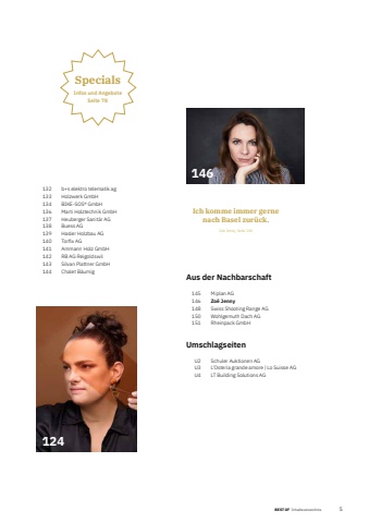 BEST OF Inhaltsverzeichnis 5124132 b+s elektro telematik ag133 Holzwerk GmbH134 BIKE-SOS%u00ae GmbH136 Marti Holztechnik GmbH137 Heuberger Sanit%u00e4r AG 138 Buess AG139 Hasler Holzbau AG140 Torfix AG141 Ammann Holz GmbH142 RB AG Reigoldswil143 Silvan Plattner GmbH144 Chalet B%u00e4umigIch komme immer gerne nach Basel zur%u00fcck. Zo%u00eb Jenny, Seite 146SpecialsInfos und AngeboteSeite 78Aus der Nachbarschaft145 Miplan AG146 Zo%u00eb Jenny148 Swiss Shooting Range AG150 Wohlgemuth Dach AG151 Rheinpack GmbHUmschlagseitenU2 Schuler Auktionen AGU3 L%u2019Osteria grande amore | Lo Suisse AGU4 LT Building Solutions AG146