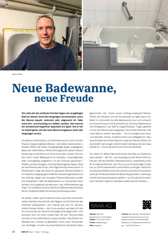 681 BEST OF BEST OF Basel %u2013 Riehen %u2013 Bettingen Portrait xxxNeue Badewanne, neue FreudeAdresse: Bawa AGBaselstrasse 12, 4125 RiehenTelefon: +41 61 641 10 90E-Mail: info@bawaag.ch Web: bawaag.ch In K%u00fcrze: Wir reparieren Emailsch%u00e4den, installieren Einsatzwannen aus Acryl, Badewannent%u00fcren in die bestehende Badewanne und Badezimmereinrichtungen %u2013 seit bald 50 Jahren.F%u00fcr viele ists der sch%u00f6nste Teil des Tages: ein ausgie biges Bad am Abend. Doch das Vergn%u00fcgen verschwindet, wenn die Wanne kaputt, zerkratzt oder abgenutzt ist. Oder wenn Ein- und Ausstieg zur Gefahr werden. Hier kommt ein schweizweit begehrter Spezialist ins Spiel. Hat er seine Arbeit getan und die neue Wanne eingebaut, kehrt das Vergn%u00fcgen zur%u00fcck.%u00abZuoberst im Dachstock, um f%u00fcnf Ecken herum, eine von drei Mauern knapp eingefasst Wanne %u2013 die sollte ersetzt werden.%u00bb Andere h%u00e4tten bei dieser Ausgangslage l%u00e4ngst aufgegeben, Bawa AG-Chef Markus M%u00fcller lief angesichts dieser Herausforderung zu Hochform auf. Man muss dazu wissen: Der Einbau einer neuen Badewanne ist komplex. Unsachgem%u00e4ss oder unsorgf%u00e4ltig ausgef%u00fchrt, ist der Schaden garantiert %u2013 %u00abPl%u00e4ttli, sanit%u00e4re Anlagen und Unterboden gehen kaputt, Wasser l%u00e4uft kontinuierlich aus. Als Folge fault das Mauerwerk. In Mieth%u00e4usern sorgt das dann f%u00fcr gr%u00f6ssere Wassersch%u00e4den.%u00bb Im Falle der eingangs geschilderten Situation gestaltete sich der Auftrag wegen den knappen Platzverh%u00e4ltnissen zus%u00e4tzlich kompliziert: Weil die Badewanne nur als Ganzes transportiert und eingebaut werden kann, war %u00abMillimeterlen%u00bb gefragt. F%u00fcr die Bawa AG eine absolute Selbstverst%u00e4ndlichkeit. Deren Professionalit%u00e4t hat erfreuliche Konsequenzen.So setzen neben zig Privatkund:innen auch die renommiertesten Sanit%u00e4r unternehmen der Region auf die Dienste des Riehener Spezialisten: %u00abIch mache das seit 25 Jahren%u00bb, erkl%u00e4rt Markus M%u00fcller %u2013 die Firma exisitert seit bald 50 Jahren und wurde von seinem Schwiegervater gegr%u00fcndet. %u00abIch erinnere mich an mein erstes Mal: Mit der Trennscheibe musste ich eine alte Wanne rausschneiden. Das fl%u00f6sste mir Respekt ein.%u00bb Dieser ist geblieben. Doch nach Tausenden von Auftr%u00e4gen ist eine traumwandlerische Sicherheit dazugekommen: Vor einem neuen Auftrag analysiert Markus M%u00fcller die Situation mit der Kundschaft und geht dann ans Werk: Er schneidet die alte Badewanne raus und sch%u00e4umt den Zwischenraum mit Kunststoff auf. Die neue Badewanne wird eingepasst, das Siphon angeschlossen, Fugen gekittet und an das Mauerwerk angepasst. Die Kundschaft kann die neue Wanne wieder benutzen %u2013 sie ist %u00fcbrigens aus Acryl und deshalb robust, hautfreundlich und pflegeleicht. Kleinere Sch%u00e4den bei Email-Wannen re pariert Markus M%u00fcller mit Kunststoff. Seit einigen Jahren bietet die Bawa AG eine Spezialit%u00e4t an %u2013 die ist bei den Kund:innen hochbeliebt.Vor allem f%u00fcr %u00e4ltere Menschen kann das Bad zur Gefahrenzone werden %u2013 der Ein- und Ausstieg aus der Wanne f%u00fchrt zu St%u00fcrzen. Mit der SenHILF-Badewannent%u00fcr sorgt Markus M%u00fcller f%u00fcr Barrierefreiheit. Die T%u00fcre ist aus hochwertigem Material, zu 100 % wasserdicht und einfach zu reinigen. Nat%u00fcrlich ist pr%u00e4zises Arbeiten auch hier zentral und nat%u00fcrlich ist dieses dank der Professionalit%u00e4t der Bawa AG garantiert. Zudem geschieht das Ganze %u00e4usserst speditiv %u2013 zur Freude der Kunden: %u00abAm n%u00e4chsten Tag kann das Bad wieder benutzt werden.%u00bbMarkus M%u00fcller