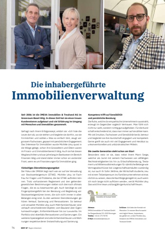 761 BEST OF BEST OF Region Arlesheim Portrait xxx Die inhabergef%u00fchrteImmobilienverwaltungAdresse:IMEXA Immobilien & Treuhand GmbHIm Margarethental 19, 4102 BinningenTelefon: +41 61 271 94 94E-Mail: immobilien@imexa.chIn K%u00fcrze: %u00abIch liebe den Kontakt mit Menschen. In meinem Beruf erwartet mich t%u00e4glich Neues, Unplanbares, das gef%u00e4llt mir%u00bb, erkl%u00e4rt Mich%u00e8le L%u00e9vy, Inhaberin der IMEXA Immobilien und Treuhand GmbH.Seit 2006 ist die IMEXA Immobilien & Treuhand AG im Grossraum Basel t%u00e4tig. In dieser Zeit hat sie einen treuen Kundenstamm aufgebaut und viel Erfahrung im Umgang mit Menschen und Immobilien gesammelt.Gefragt nach ihrem Erfolgsrezept, erkl%u00e4rt sie: %u00abIch hole die Leute dort ab, wo sie stehen und begleite sie dorthin, wo sie hinm%u00f6chten und sollten.%u00bb Was so einfach t%u00f6nt, zeugt von grossem Fachwissen, gepaart mit pers%u00f6nlichem Engagement. Das Interesse f%u00fcr Immobilien wurde Mich%u00e8le L%u00e9vy quasi in die Wiege gelegt, schon ihre Grosseltern und Eltern waren im Finanz- und Immobilienbereich t%u00e4tig. Auch sie hat diesen Weg beschritten und war jahrelang im Bankwesen im Bereich Finanzen t%u00e4tig und stand daher immer schon an vorderster Front, wenn es um Finanzierungen f%u00fcr Immobilien ging. Vielseitiges Dienstleistungsangebot Der Fokus der IMEXA liegt nach wie vor auf der Verwaltung von Stockwerkeigentum (STWE). Mich%u00e8le L%u00e9vy ist Fachfrau f%u00fcr Fragen und Probleme, die bei STWE auftreten k%u00f6nnen. Trotz vorhandenem Reglement und den geltenden gesetzlichen Bestimmungen stellen sich dennoch oftmals Fragen, die es zu beantworten gilt. Auch ben%u00f6tigt es viel Fingerspitzengef%u00fchl bei der Beratung und Begleitung von Stockwerkeigen t%u00fcmer:innen, die sich nicht immer in allen Belangen einig sind. Zu den weiteren Dienstleistungen geh%u00f6ren Verkauf, Sanierung und Renovationen. So betreut und verwaltet Mich%u00e8le L%u00e9vy auch Mehrfamilienh%u00e4user oder verkauft verschiedenste Objekte; vom Bauland %u00fcber Eigentumswohnungen, Einfamilienh%u00e4user bis zur Luxusvilla. Im Portfolio sind ebenfalls Renovationen und Sanierungen. Ein weiteres Spezialgebiet sind alte Einfamilienh%u00e4user und Wohnungen respektive deren Instandhaltung und Sanierung. Kompetenz trifft auf Sensibilit%u00e4t und pers%u00f6nliche BeratungDie Ruhe, welche die empathische Unternehmerin ausstrahlt, erzeugt im Gegen%u00fcber sogleich Vertrauen. Man f%u00fchlt sich nicht nur wohl, sondern richtig gut aufgehoben. F%u00fcr die Kundschaft entscheidend ist, dass man immer auf sie z%u00e4hlen kann. Mit viel Intuition, Fachwissen und Sensibilit%u00e4t ber%u00e4t, betreut und begleitet sie ihre Kundschaft engagiert und kompetent. Gerne greift sie auch mit viel Engagement und Herzblut zu unkonventionellen und unb%u00fcrokratischen Mitteln. Die zweite Generation steht schon am StartBesonders stolz ist sie, dass nebst ihrem Mann Serge, welcher als Jurist mit seinem Fachwissen von allf%u00e4lligen Rechtsstreitigkeiten bis hin zu Erbschaftsberatung, Testament und Willensvollstreckungen f%u00fcr s%u00e4mtliche Belange wie Vertragsabschl%u00fcsse bei Liegenschaftsverk%u00e4ufen zust%u00e4ndig ist, nun auch ihr Sohn J%u00e9r%u00f4me, der Wirtschaft studierte, neu mit einem Teilzeitpensum ins Familienunternehmen eintrat. %u00abSch%u00f6n zu wissen, dass die Nachfolge geregelt ist, auch wenn ich noch lange nicht aufh%u00f6ren werde%u00bb, verr%u00e4t Mich%u00e8le L%u00e9vy. Das wird ihre treue und langj%u00e4hrige Kundschaft freuen.