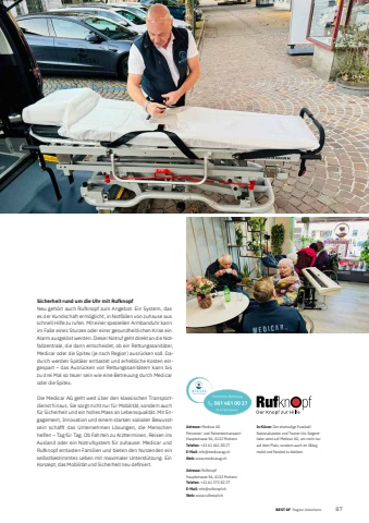 BEST OFBEST OF Region Arlesheim Portrait xxx 872Adresse: Medicar AGPersonen- und PatiententransportHauptstrasse 56, 4132 MuttenzTelefon: +41 61 461 00 27E-Mail: info@medicarag.chWeb: www.medicarag.chAdresse: RufknopfHauptstrasse 56, 4132 MuttenzTelefon: +41 61 373 82 27E-Mail: info@rufknopf.chWeb: www.rufknopf.chIn K%u00fcrze: Der ehemalige FussballNationalspieler und Trainer Urs Siegenthaler setzt auf Medicar AG, um nicht nur auf dem Platz, sondern auch im Alltag mobil und flexibel zu bleiben.Sicherheit rund um die Uhr mit RufknopfNeu geh%u00f6rt auch Rufknopf zum Angebot. Ein System, das es der Kundschaft erm%u00f6glicht, in Notf%u00e4llen von zuhause aus schnell Hilfe zu rufen. Mit einer speziellen Armbanduhr kann im Falle eines Sturzes oder einer gesundheitlichen Krise ein Alarm ausgel%u00f6st werden. Dieser Notruf geht direkt an die Notfallzentrale, die dann entscheidet, ob ein Rettungssanit%u00e4ter, Medicar oder die Spitex (je nach Region) ausr%u00fccken soll. Dadurch werden Spit%u00e4ler entlastet und erhebliche Kosten eingespart %u2013 das Ausr%u00fccken von Rettungssanit%u00e4tern kann bis zu drei Mal so teuer sein wie eine Betreuung durch Medicar oder die Spitex.Die Medicar AG geht weit %u00fcber den klassischen Transportdienst hinaus. Sie sorgt nicht nur f%u00fcr Mobilit%u00e4t, sondern auch f%u00fcr Sicherheit und ein hohes Mass an Lebensqualit%u00e4t. Mit Engagement, Innovation und einem starken sozialen Bewusstsein schafft das Unternehmen L%u00f6sungen, die Menschen helfen %u2013 Tag f%u00fcr Tag. Ob Fahrten zu Arztterminen, Reisen ins Ausland oder ein Notrufsystem f%u00fcr zuhause: Medicar und Rufknopf entlasten Familien und bieten den Nutzenden ein selbstbestimmtes Leben mit maximaler Unterst%u00fctzung. Ein Konzept, das Mobilit%u00e4t und Sicherheit neu defi niert.