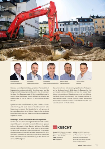 BEST OFBEST OF Region Arlesheim Portrait xxx 932Adresse: KNECHT Bauunternehmung AGBuchenstrasse 59, 4142 M%u00fcnchensteinTelefon: +41 61 413 83 33E-Mail: info@kbag.chWeb: www.kbag.chIn K%u00fcrze: Die KNECHT Bauunternehmung AG denkt immer mit und optimiert Ideen stets im Sinne ihrer Kunschaft. So l%u00e4sst sich auch nachvollziehen, warum man schon %u00fcber ein Vierteljahrhundert erfolgreich besteht.J%u00e9r%u00e9my Guidoum, Bauf%u00fchrerR%u00fcckbau sowie Spezialtiefbau%u00bb, pr%u00e4zisiert Patrick Weibel. Dazu geh%u00f6ren selbstverst%u00e4ndlich der Abtransport und die fachgerechte Entsorgung in den Deponien. Von der kleinsten Sondage %u00fcber Baugrubenaushub bis hin zu Altlastensanierungen bietet die Wenger Knecht AG jegliche Arbeiten als Gesamtpaket an und ist bekannt f%u00fcr ihre optimierten Bauabl%u00e4ufe.Speziell erw%u00e4hnt werden darf auch, dass die KNECHT Bauunternehmung AG auch kleinere Kundenarbeiten oder Reparaturen anbietet. Die Bandbreite ist sehr gross und kann vom Betonieren einer kleinen Mauer im Garten bis zu einem Badumbau reichen. Viele Umbaubed%u00fcrfnisse k%u00f6nnen abgedeckt werden.Lebendiger, vitaler und kreativer AusbildungsbetriebDie KNECHT Bauunternehmung AG bildet Lernende als Maurer/in EFZ aus. Es ist beiden Gesch%u00e4ftsf%u00fchrern ein grosses Anliegen, dem auch in ihrer Branche sp%u00fcrbaren Fachkr%u00e4ftemangel die Stirn zu bieten, und junge Leute an den sch%u00f6nen und kreativen Maurerberuf heranzuf%u00fchren. Ein Unterfangen, das heutzutage und speziell bei Handwerkerberufen nicht mehr ganz so einfach ist. Wer sich f%u00fcr eine Lehre interessiert, fi ndet in der KNECHT Bauunternehmung AG den idealen F%u00f6rderer und Arbeitgeber.Das Unternehmen mit seinen sympathischen Protagonisten ist der beste Beweis daf%u00fcr, dass die Baubranche vital und kreativ ist. Das KMU liebt und lebt eine ideale Teamkultur mit motivierten Mitarbeitenden und hat nicht nur die ideale Gr%u00f6sse, sondern auch das n%u00f6tige Know-how f%u00fcr Mehrfamilien h%u00e4user, grosse %u00dcberbauungen, Reihen-Einfamilienh%u00e4user sowie Gewerbe- und Industriebauten. Seit %u00fcber 25 Jahren %u2013 einfach anders.Christoph Rentsch, Inhaber/Gesch%u00e4ftsleitungPatrick Weibel, Inhaber/Gesch%u00e4ftsleitungRichard Borer, Leiter Finanzen/Gesch%u00e4ftsleitungMatthias Zamarlik, Kalkulator/Bauf%u00fchrer