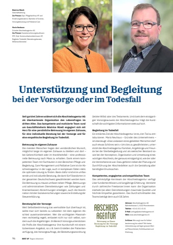 961 BEST OF BEST OF Region Arlesheim Portrait xxx Unterst%u00fctzung und Begleitung bei der Vorsorge oder im TodesfallAdresse: Abschiedsagentur AGBahnhofstrasse 3, 4142 M%u00fcnchensteinTelefon: +41 61 411 41 41E-Mail: anfrage@abschiedsagentur.chWeb: www.abschiedsagentur.chIn K%u00fcrze: Wie sorgt man f%u00fcr Selbstbestimmung bis zuletzt? Wir bieten Unterst%u00fctzung und legen grossen Wert auf Menschlickeit, Einf%u00fchlsamkeit und Erfahrung.Seit gut drei Jahren widmet sich die Abschieds agen tur AG als %u00fcberkantonale Organisation den Lebensfragen im dritten Alter. Das kompetente und motivierte Team rund um Gesch%u00e4ftsleiterin B%u00e9atrice R%u00fcedi engagiert sich mit Herz f%u00fcr eine pers%u00f6nliche Betreuung im eigenen Zuhause, f%u00fcr eine individuelle Beratung bei der Vorsorge und f%u00fcr eine empathische Begleitung im Todesfall. Betreuung im eigenen ZuhauseDie meisten Menschen hegen den verst%u00e4ndlichen Wunsch, m%u00f6glichst lange im eigenen Zuhause zu bleiben und dort %u2013 bei Gebrechlichkeit oder im Krankheitsfall %u2013 eine professionelle Betreuung nach Mass zu erhalten. Dank einem kompetenten Team mit Fachleuten in den Bereichen Pflege und Begleitung, Care Management und Palliative Care ist die Abschiedsagentur in der Lage, auch in komplexen F%u00e4llen stets die optimale L%u00f6sung zu fi nden. Basis daf%u00fcr sind eine umfassende und individuelle Beratung, die dank f%u00fcnf Standorten in der gesamten Deutschschweiz gew%u00e4hrleistet werden kann. Die Betreuung zu Hause umfasst neben Pflege, Betreuungsund administrativen Dienstleistungen wie Zahlungen und Krankenkassen-Abrechnungen erledigen, auch die Koordination mit den Sozialversicherungen sowie die Erstellung der Steuererkl%u00e4rung. Beratung bei der VorsorgeWeil Selbstbestimmung das wertvollste Gut %u00fcberhaupt ist, sollte man sich bereits zu Lebzeiten mit dem eigenen Abschied auseinandersetzen. Wer die wichtigsten Massnahmen rechtzeitig regelt, entlastet nicht nur sich selbst, sondern auch die Angeh%u00f6rigen. Im Bereich Vorsorge unterst%u00fctzen die Profi s der Abschiedsagentur ihre Kundschaft mit einem l%u00fccken losen Angebot, so z. B. beim Erstellen der Patientenverf%u00fcgung, des Vorsorgeauftrags, der Bestattungsanordnung (letzter Wille) oder des Testaments. Und dank dem einzigartigen Vorsorgeausweis der Abschiedsagentur tr%u00e4gt die Kundschaft die wichtigsten Informationen stets auf sich.Begleitung im TodesfallEin erkl%u00e4rtes Ziel der Abschiedsagentur ist es, den Tod zu enttabuisieren. Mario Neuhaus %u2013 Gr%u00fcnder des Unternehmens %u2013 ist %u00fcberzeugt: %u00abDas Loslassen eines geliebten Menschen darf auch etwas Sch%u00f6nes sein.%u00bb Um dies zu gew%u00e4hrleisten, unterst%u00fctzt die Abschiedsagentur Familien, Angeh%u00f6rige und Freunde bei der Sterbebegleitung und als seelischer Beistand sowie bei der Konzeption, Organisation und Umsetzung eines w%u00fcrdigen Abschieds, der genauso einzigartig ist, wie der oder die Verstorbene es war. Dazu geh%u00f6ren neben der Planung und Durchf%u00fchrung der Abschiedsfeier auch die Gestaltung aller ben%u00f6tigten Drucksachen.Kompetentes, engagiertes und empathisches TeamDas zehnk%u00f6pfi ge Kernteam der Abschiedsagentur verf%u00fcgt %u00fcber fundiertes Wissen und langj%u00e4hrige Erfahrung. Verst%u00e4rkt durch zahlreiche Freelancer:innen kann die Organisation deshalb bei allen Dienstleistungen maximale Qualit%u00e4t und h%u00f6chste Empathie garantieren. Das Durchschnittsalter des Teams betr%u00e4gt denn auch 58 Jahre.B%u00e9atrice R%u00fcedi:Gesch%u00e4ftsleitungZur Person: Dipl. Pflegefachfrau HF und Ern%u00e4hrungsberaterin; Bachelor of Science, Vorsorgeberatung und Palliative CareMario Neuhaus: Gr%u00fcnder Abschiedsagentur AGZur Person: Sozialversicherungs kaufmann EFZ, Dipl. Kommunikationsfachmann HF, Begleiter Todesfall, Bestattungsberater, Willensvollstrecker