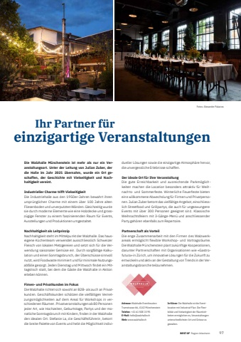 BEST OFBEST OF Region Arlesheim Portrait xxx 971 Ihr Partner f%u00fcr einzigartige VeranstaltungenAdresse: Walzhalle EventlocationTramstrasse 66, 4142 M%u00fcnchensteinTelefon: +41 61 508 15 95E-Mail: hello@walzhalle.chWeb: www.walzhalle.chIn K%u00fcrze: Die Walzhalle ist die Eventlocation mit Industrial-Flair. Die Flexibilit%u00e4t und Vielseitigkeit der R%u00e4umlichkeiten erm%u00f6glichen es, Veranstal tungen unterschiedlichster Art und Gr%u00f6sse zu gestalten.Die Walzhalle M%u00fcnchenstein ist mehr als nur ein Veranstaltungsort. Unter der Leitung von Julian Zuber, der die Halle im Jahr 2021 %u00fcbernahm, wurde ein Ort geschaffen, der Geschichte mit Vielseitigkeit und Nachhaltigkeit vereint.Industrieller Charme trifft VielseitigkeitDie Industriehalle aus den 1950er-Jahren bewahrt ihren urspr%u00fcnglichen Charme mit einem %u00fcber 100 Jahre alten Fliesen boden und unverputzten W%u00e4nden. Gleichzeitig wurde sie durch moderne Elemente wie eine Holzdecke und grossz%u00fcgige Fenster zu einem faszinierenden Raum f%u00fcr Events, Ausstellungen und Produktionen umgestaltet.Nachhaltigkeit als LeitprinzipNachhaltigkeit steht im Mittelpunkt der Walzhalle. Das hauseigene K%u00fcchenteam verwendet ausschliesslich Schweizer Fleisch von lokalen Metzgereien und setzt sich f%u00fcr die Verwendung saisonaler Gem%u00fcse ein. Durch sorgf%u00e4ltige Kalkulation und einen Sonntagsbrunch, der %u00dcbersch%u00fcsse sinnvoll nutzt, wird Foodwaste minimiert und f%u00fcr minimale Nutzungsabf%u00e4lle gesorgt. Jeden Dienstag und Mittwoch fi ndet ein Mittagstisch statt, bei dem die G%u00e4ste die Walzhalle in Aktion erleben k%u00f6nnen.Fimen- und Privatkunden im FokusDie Walzhalle richtet sich sowohl an B2B- als auch an Privatkunden. Gesch%u00e4ftskunden sch%u00e4tzen die vielf%u00e4ltigen Vernetzungsm%u00f6glichkeiten auf dem Areal f%u00fcr Workshops in verschiedenen R%u00e4umen. Privatveranstaltungen ab 80 Personen jeder Art, wie Hochzeiten, Geburtstage, Partys und der monatliche Sonntagsbrunch mit Kindern, fi nden in der Walzhalle den idealen Ort. Stefanie La, die Gesch%u00e4ftsf%u00fchrerin, betont die breite Palette von Events und hebt die M%u00f6glichkeit individueller L%u00f6sungen sowie die einzigartige Atmosph%u00e4re hervor, die unvergessliche Erlebnisse schaffen.Der ideale Ort f%u00fcr Ihre VeranstaltungDie gute Erreichbarkeit und ausreichende Parkm%u00f6glichkeiten machen die Location besonders attraktiv f%u00fcr Weihnachts- und Sommerfeste. Winterliche Feuerfeste bieten eine willkommene Abwechslung f%u00fcr Firmen und Privatpersonen. Julian Zuber betont das vielf%u00e4ltige Angebot, einschliesslich Streetfood und Grillpartys, die auch f%u00fcr ungezwungene Events mit %u00fcber 300 Personen geeignet sind. Klassische Weihnachtsfeiern mit 3-G%u00e4nge-Men%u00fc und anschliessender Party geh%u00f6ren ebenfalls zum Repertoire.Partnerschaft als VorteilDie enge Zusammenarbeit mit den Firmen des Walzwerkareals erm%u00f6glicht flexible Workshop- und Vortragsr%u00e4ume. Die Walzhalle M%u00fcnchenstein plant zuk%u00fcnftige Kooperationen, darunter Partnerschaften mit Organisationen wie %u00abGastrofutura%u00bb in Z%u00fcrich, um innovative L%u00f6sungen f%u00fcr die Zukunft zu entwickeln und aktiv an der Gestaltung von Trends in der Veranstaltungsbranche teilzunehmen.Fotos: Alexander Palacios