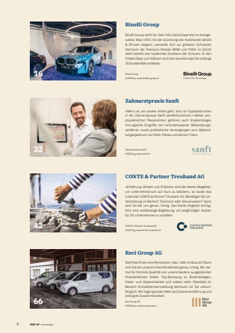 81 BEST OF BEST OF Voranzeigen TeaserBinelli GroupBinelli Group steht f%u00fcr %u00fcber 104 Jahre Expertise im Autogewerbe. Was 1921 mit der Gr%u00fcndung des Autohandel Binelli & Ehrsam begann, wandelte sich zur gr%u00f6ssten Schweizer Partnerin der Premium Marken BMW und MINI. In Z%u00fcrich steht bereits das modernste Autohaus der Schweiz. In den Filialen Baar und Adliswil wird das neue Konzept bis anfangs 2026 ebenfalls erlebbar.Zahnarztpraxis Sanft%u00abWenn es um unsere Arbeit geht, sind wir Spezialist:innen in der Zahnarztpraxis Sanft perfektionistisch.%u00bb Neben prophylaktischen Massnahmen geh%u00f6ren auch Implantologie, chirurgische Eingriffe mit minimalinvasiven Behandlungsverfahren sowie prothetische Versorgungen zum Behandlungsspektrum von Peter Plewa und seinem Team.CONTE & Partner Treuhand AG%u00abErfahrung, Wissen und Pr%u00e4zision sind die besten Begleiter, um unternehmerisch auf Kurs zu bleiben%u00bb, so lautet das Credo der CONTE & Partner Treuhand AG. Ben%u00f6tigen Sie Unterst%u00fctzung im Bereich Treuhand oder Steuerwesen? Dann sind Sie bei uns genau richtig. Das breite Angebot erm%u00f6glicht eine erstklassige Begleitung, um langfristigen Nutzen f%u00fcr Ihr Unternehmen zu schaffen.Reci Group AGSteht bei Ihnen eine Renovation, Neu- oder Umbau an? Dann sind Sie bei unserem Familienbetrieb genau richtig. Wir stehen f%u00fcr h%u00f6chste Qualit%u00e4t und unsere bestens ausgebildeten Mitarbeitenden bieten Top-Beratung zu Bodenbel%u00e4gen, Maler- und Gipserarbeiten und vielem mehr. Ebenfalls im Bereich Immobilienvermarktung betreuen wir Sie vollumf%u00e4nglich. Wir legen grossen Wert auf pr%u00e4zise Ausf%u00fchrung und eine gute Zusammenarbeit.Binelli Group6340 Baar, www.binelli-group.chZahnarztpraxis Sanft6300 Zug, www.sanft.chCONTE & Partner Treuhand AG6300 Zug, www.conte-treuhand.chReci Group AG6340 Baar, www.reci-group.ch163266 lll42