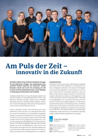 BEST OF BEST OFPortrait xxx Zug Berg 101Am Puls der Zeit %u2013 innovativ in die Zukunft Adresse: Elektro Weber Partner AGAlte Landstrasse 7, 6313 MenzingenTelefon: +41 41 755 20 20E-Mail: info@ewp.agWeb: www.elektroweberpartner.chIn K%u00fcrze: Effi zient, innovativ, nachhaltig: Die Elektro Weber Partner AG zeigt, wie modernste Technik und Energieeffi zienz nahtlos zusammenspielen.Die Elektro Weber Partner AG bietet individuelle L%u00f6 sungen f%u00fcr alle elektrischen Anliegen. Das professionelle Team verbindet fundierte Expertise mit modernster Technik. Besonders aktuell sind zurzeit die Umr%u00fcstung auf LEDLeuchten sowie die Geb%u00e4udeautomation %u00abSmart Building%u00bb in Verbindung mit Photovoltaik und E-Mobilit%u00e4t.Die Elektro Weber Partner AG aus Menzingen realisiert individuelle L%u00f6sungen f%u00fcr individuelle Bed%u00fcrfnisse. Dies in den Bereichen alternative Energien, Beleuchtung, E-Mobilit%u00e4t, Geb%u00e4udeautomation, Ger%u00e4tepr%u00fcfungen, Glasfaser, Umbauten und Zentralstaubsauger. Dabei sind die Fachspezialisten immer auf dem neusten Stand der Technik.Eines der aktuellen Themen ist die Umr%u00fcstung von Leuchtstoffr%u00f6hren auf LED-Leuchten. Vor mittlerweile %u00fcber einem Jahr wurde die Produktion von Leuchtstoffr%u00f6hren eingestellt. Lediglich der Verkauf von Restposten ist noch erlaubt. Daher ist es Zeit, an eine Umr%u00fcstung zu denken. Daf%u00fcr ist die Elektro Weber Partner AG die geeignete Ansprechpartnerin. Eine Umr%u00fcstung steigert die Energieeffi zienz und senkt die Stromkosten. Auch die Wartungskosten fallen bei LED-Leuchten geringer aus als bei Leuchtstoffr%u00f6hren, womit sich eine solche Investition auf lange Sicht lohnt. Die Elektro Weber Partner AG %u00fcbernimmt dabei s%u00e4mtliche Arbeiten f%u00fcr Private, Gewerbe und Industrie von der Planung bis hin zur Installation.ZukunftsorientiertEbenfalls ein Thema, das zurzeit in aller Munde ist: Geb%u00e4udeautomation oder %u00abSmart Building%u00bb in der Fachsprache. Ein solch %u00abintelligentes Geb%u00e4ude%u00bb nutzt moderne Technologien und Automatisierungssysteme, welche diesem ein Herz verleihen. Dabei werden verschiedene Systeme im Haus wie Beleuchtung, Heizung, L%u00fcftung, Jalousien oder Sicherheitsanlagen miteinander vernetzt und zentral gesteuert. Dies ist ein bedeutender Schritt in Richtung Komfort, Sicherheit und Energieeffi zienz. F%u00fcr die zentrale Steuerung wird unter anderem die KNX-Technologie eingesetzt, ein international standardisiertes System zur Geb%u00e4udeautomation. Die Elektro Weber Partner AG projektiert und realisiert solche Systeme f%u00fcr Privatgeb%u00e4ude, Gewerbe und Industrie. Sie ist also stets am Puls der Zeit, um f%u00fcr die Kundschaft in und um Menzingen zeitgem%u00e4sse, kostensparende und kompetente Dienstleistungen im Bereich Elektroinstallationen zu erbringen.