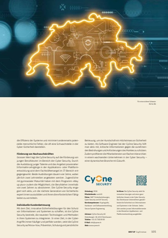 BEST OF Zug Ennetsee 105BEST OF Portrait xxx 2Gr%u00fcndung: 2018Mitarbeitende: rund 65Fokus: 360%u00b0-Sicherheitsl%u00f6sungen,Cyber Security und IoT SecurityKernkompetenzen: Kryptografi e, Hardware- und Softwareentwicklung, Secure System EngineeringAdresse: CyOne Security AGHinterbergstr. 18, 6312 SteinhausenTelefon: +41 41 748 85 00E-Mail: info@cyone.chWeb: www.cyone.chIn K%u00fcrze: Die CyOne Security steht f%u00fcr innovative L%u00f6sungen und einen ganzheitlichen Ansatz in der Cyber Security. Das Steinhauser Unternehmen gew%u00e4hrleistet die Sicherheit von Informationen und Systemen in der Schweiz. Jedes Jahr werden je zwei Informatiklernende in den Bereichen Applikations- und Plattformentwicklung ausgebildet. die Effi zienz der Systeme und minimiert andererseits potenzielle menschliche Fehler, die oft eine Schwachstelle in der Cyber-Sicherheit darstellen.F%u00f6rderung von Nachwuchskr%u00e4ftenGrossen Wert legt die CyOne Security auf die F%u00f6rderung von jungen Berufsleuten im Bereich der Cyber Security. Durch die Ausbildung junger Talente und das Angebot praxisnaher Informatik-Lehrg%u00e4nge in der Applikations- oder Plattformentwicklung wird dem Fachkr%u00e4ftemangel im IT-Bereich entgegengewirkt. Beide Ausbildungen dauern vier Jahre, wobei j%u00e4hrlich zwei Lehrstellen angeboten werden. Jugendliche mit gymnasialer Maturit%u00e4t haben mit dem Programm %u00abWay up plus%u00bb zudem die M%u00f6glichkeit, die Berufslehre innerhalb von zwei Jahren zu absolvieren. Die CyOne Security engagiert sich aktiv, um die n%u00e4chste Generation von Sicherheitsexpert:innen auszubilden und ihnen die erforderlichen F%u00e4higkeiten zu vermitteln.Individuelle KundenbetreuungMit dem Ziel, innovative Sicherheitsl%u00f6sungen f%u00fcr den Schutz von Informationen und Systemen zu schaffen, ist die CyOne Security bestrebt, die neuesten Technologien und Methoden in ihren Systemen zu integrieren. In einer Zeit, in der CyberAngriffe immer h%u00e4ufi ger und perfi der werden, setzt die CyOne Security auf Know-how, Pr%u00e4vention, Schulung und pers%u00f6nliche Betreuung, um der Kundschaft ein H%u00f6chstmass an Sicherheit zu bieten. Als Software Engineer bei der CyOne Security hilft man aktiv mit, kritische Informationen gegen die zunehmenden Bedrohungen und Anforderungen des Marktes zu sch%u00fctzen. Zudem profi tieren die Mitarbeitenden von flachen Hierarchien in einem wachsenden Unternehmen in der Cyber Security %u2013 einer dynamischen Branche mit Zukunft.F%u00fcr eine sichere Schweiz: Bit f%u00fcr Bit