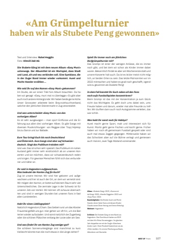 BEST OF BEST OF Promi 1072Text und Intervie Rahel HegglinFoto: Hitmill 360 AGDie Stubete G%u00e4ng ist mit dem neuen Album %u00abEasy Muni%u00bb unterwegs. Der Albumtitel ist ein Wortspiel, dass Stadt und Land, alt und neu verbinden soll. Eine Symbiose, die in der Zuger Band immer wieder vorkommt. Aurel und Moritz Hassler erz%u00e4hlen %u2026Wie seid Ihr auf den Namen %u00abEasy Muni%u00bb gekommen?Im Studio, als wir einen Titel f%u00fcrs Album brauchten. Da haben wir gesagt: %u00abEasy, muni mal no %u00fcberlegge.%u00bb Es gibt aber auch noch andere Hintergr%u00fcnde: Wir haben beide gerne K%u00fche. Unser Grossvater arbeitete beim Braunviehzuchtverband, welcher den j%u00e4hrlichen Stierenmarkt in Zug veranstaltet. Und was unterscheidet %u00abEasy Muni%u00bb von den vorherigen Alben?Es ist sehr ausgewogen %u2013 man sp%u00fcrt Einfl%u00fcsse und die Erfahrung aus allen drei vorherigen Alben. Es gibt Songs mit diversen Musikrichtungen: von Reggae %u00fcber Trap / HipHop bis zu Dance und zur Ballade. Eure Tour bringt Euch bis nach Deutschland und %u00d6sterreich. Eure Songs sind aber auf Schweizerdeutsch. Singt das Publikum trotzdem mit?Und wie. Das ist schon sehr speziell. Das Publikum im nahen Ausland geht immer sehr eindr%u00fccklich ab an unseren Konzerten und sie m%u00f6chten, dass wir schweizerdeutsch reden und singen. F%u00fcr gewisse Menschen f%u00fchlt sich das verbundener und n%u00e4her an. Ihr seid in Hagendorn aufgewachsen. Was bedeutet der Kanton Zug f%u00fcr Euch?Zug ist unsere Heimat. Wir sind hier geboren und aufgewachsen und hier ist auch der Ort, an dem wir vernetzt sind. Wir m%u00f6gen den Kanton, er bietet auf kleinem Raum sehr viel Unterschiedliches. Die zentrale Lage in der Schweiz ist f%u00fcr unseren Job von Vorteil. Wir k%u00f6nnen oft zuhause %u00fcbernachten und sind in wenigen Stunden bei unseren Fans in fast allen Landesteilen.Habt Ihr einen Lieblingsplatz?Nat%u00fcrlich Hagendorn/Cham. Das Gebiet rund um das Kloster Frauental gef%u00e4llt uns gut. Hier gehen wir oft hin, um die Batterien wieder aufzuladen. Und sonst nat%u00fcrlich der Zugerberg oder die sch%u00f6nen Pl%u00e4tzchen entlang der Lorze oder am See. Und was fi ndet Ihr am Kanton Zug weniger gut?Die sch%u00f6nen Sonnenunterg%u00e4nge sind manchmal zu kurz. Vielleicht k%u00f6nnte man die noch etwas in die L%u00e4nge ziehen? Spielt Ihr immer noch am j%u00e4hrlichen Dorfgr%u00fcmpelturnier mit? Das Gr%u00fcmpi ist einer der wenigen Anl%u00e4sse, die es immer noch gibt, und bei dem wir schon als Kinder immer dabei waren. Bekanntlich fi ndet es aber am Wochenende statt und unsere Konzerte halt auch. Da ist es leider meist nicht m%u00f6glich, an beiden Orten zu sein. Das letzte Mal konnten wir im 2022 mitmachen und haben es grad noch geschafft, irgendwie zu gewinnen als Stubete Peng!In dem Fall konntet Ihr Euch neben all den Fans noch aufs Fussballspielen konzentrieren?Beim Gr%u00fcmpi ist das mit der Konzentration ja zum Gl%u00fcck nicht das Wichtigste. Es geht doch ums dabei sein, ums Freude haben und darum, wieder mal alte Freunde zu treffen. Wir durften dann auch noch Autogramme verteilen, das war sch%u00f6n.Was habt Ihr sonst noch f%u00fcr Hobbys? Aurel macht gerne Sport, malt und interessiert sich f%u00fcr Kunst. Moritz geht gerne Fischen und kocht gerne. Fr%u00fcher haben wir noch oft gemeinsam Fussball gespielt oder sind auch mal etwas Joggen gegangen. Mittlerweile haben wir das Schwitzen aber auf die B%u00fchne verlegt und geniessen auch mal ein, zwei Tage Abstand voneinander. Alben: %u00abStubete G%u00e4ng%u00bb 2019, %u00abDunne mit de G%u00e4ng%u00bb 2020, %u00abHoodie G%u00e4ggeler%u00bb 2022 und %u00abEasy Muni%u00bb 2024Bandmitglieder: Die Br%u00fcder Aurel und Moritz Hassler, deren Vater Hans und dessen Bruder Claudio sowie Oliver Herzog und Simon BritschgiWohnort: HagendornIn K%u00fcrze: Die Stubete G%u00e4ng ist eine Band aus Hagendorn. Den Durchbruch hatten sie 2019 mit dem Hit %u00abPetra Sturzenegger%u00bb. Im gleichen Jahr doppelten sie mit der Single %u00abG%u00f6schene Airolo%u00bb nach. Ihren Musikstil bezeichnen sie als %u00ab%u00d6rbn L%u00e4ndler%u00bb. Es ist eine Mischung aus Beats, Akkordeon und Klarinette. %u00abAm Gr%u00fcmpelturnier haben wir als Stubete Peng gewonnen%u00bb